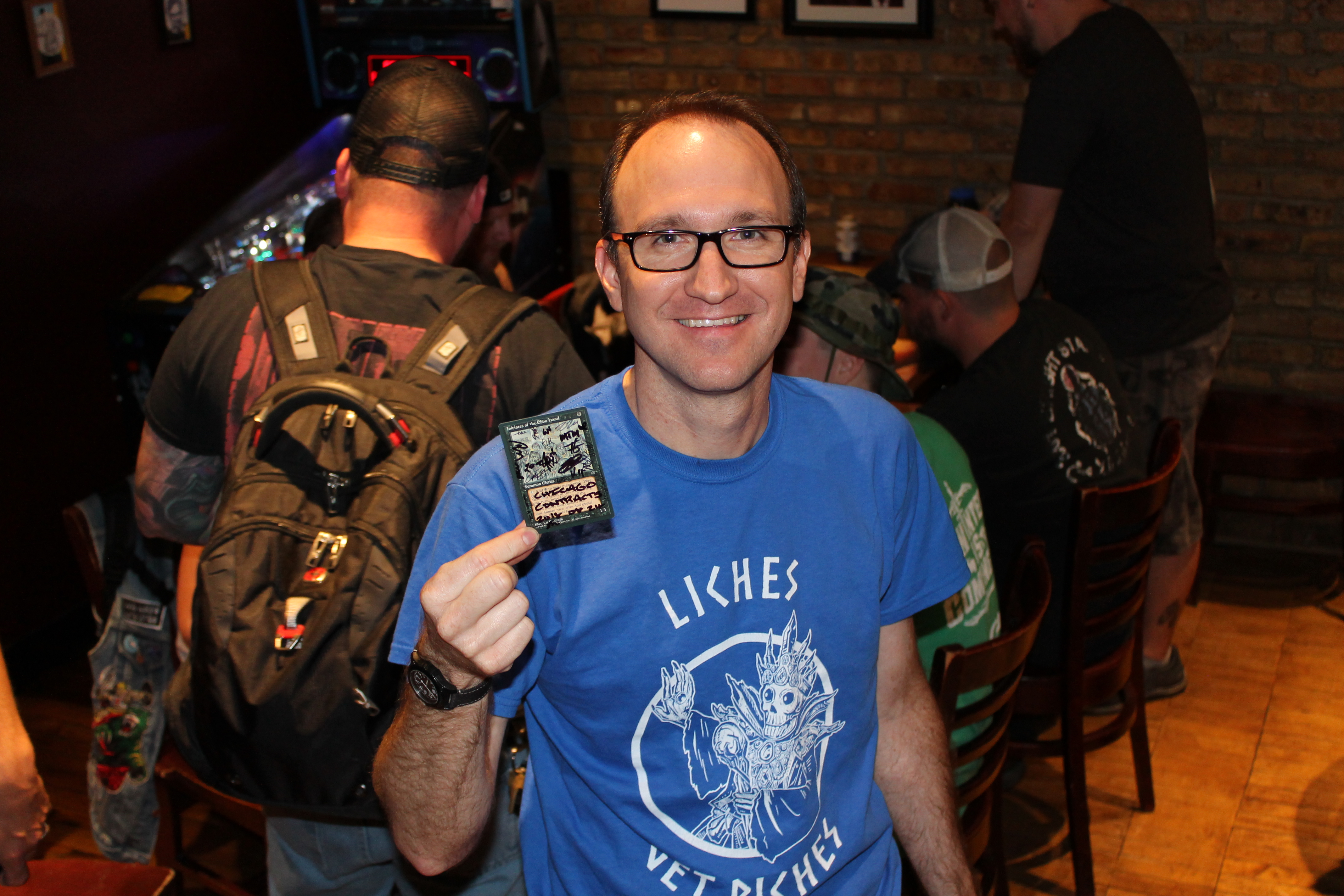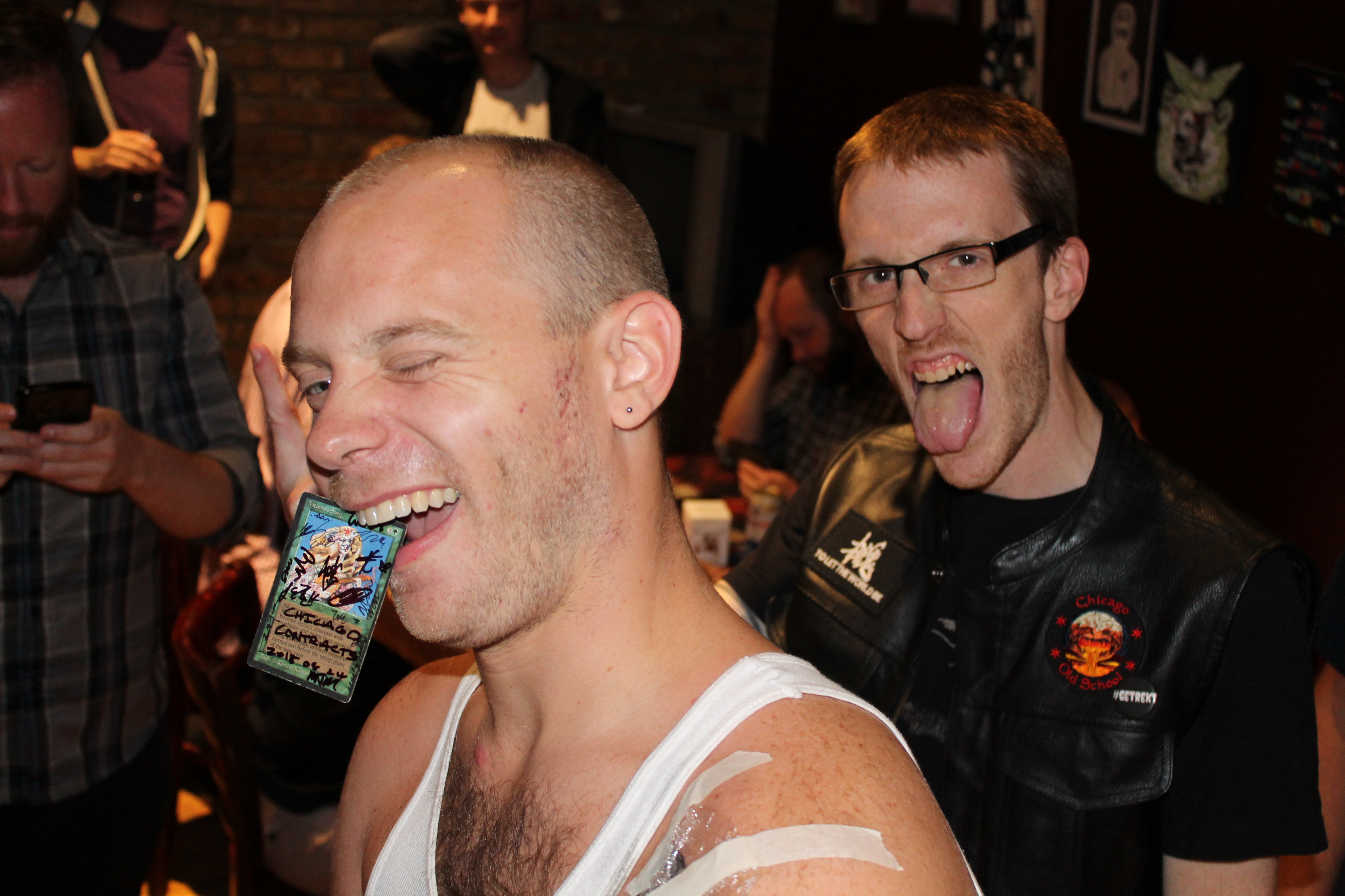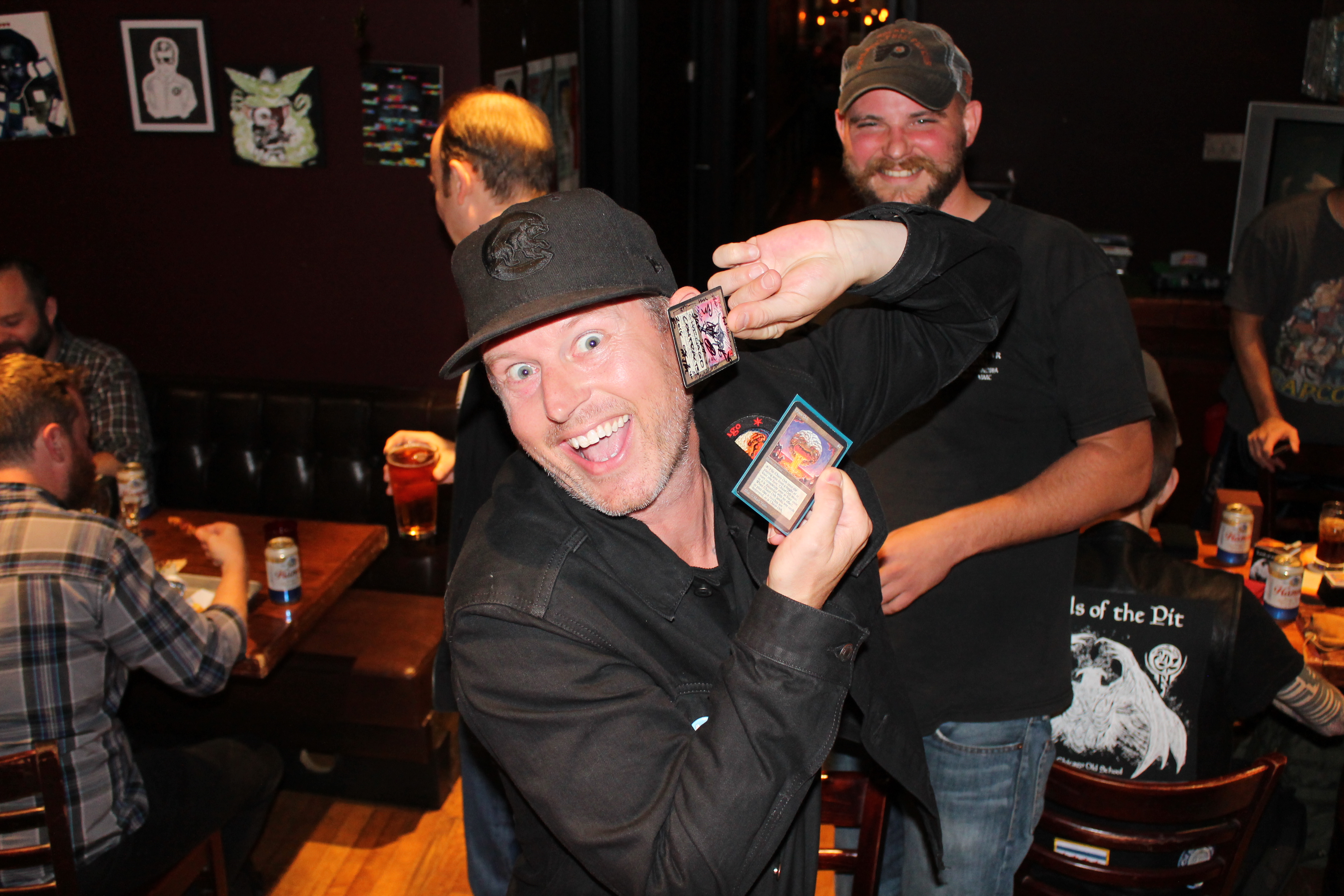 I sat alone at Kuma’s bar nursing my Old Fashioned and watching Fight Club. Proved apropos. It was late afternoon and it was going to be a long, long weekend of boozing and Magic, in that order. A gang of Lords met for dinner (our proverbial Last Supper) after which we crossed Belmont Ave, ever-under-construction, to DMen, down the long hallway to the backroom where wizards were already congregating. Preliminary Hamms and Kabanes were had and it was time to mingle with the dudesweats. The Magic started our mildly. I battled Lord Etters in a test matchup using our decks for the following day (Atogs vs. Naya). Nothing sinister quite yet. More dudes arrived. Hugs, handshakes, beers. Prize cards appeared, signatures accumulated, and the stench of Old School filled the air as metal music set the tone. Suddenly, the first one rang out like a Satan’s firebolt: