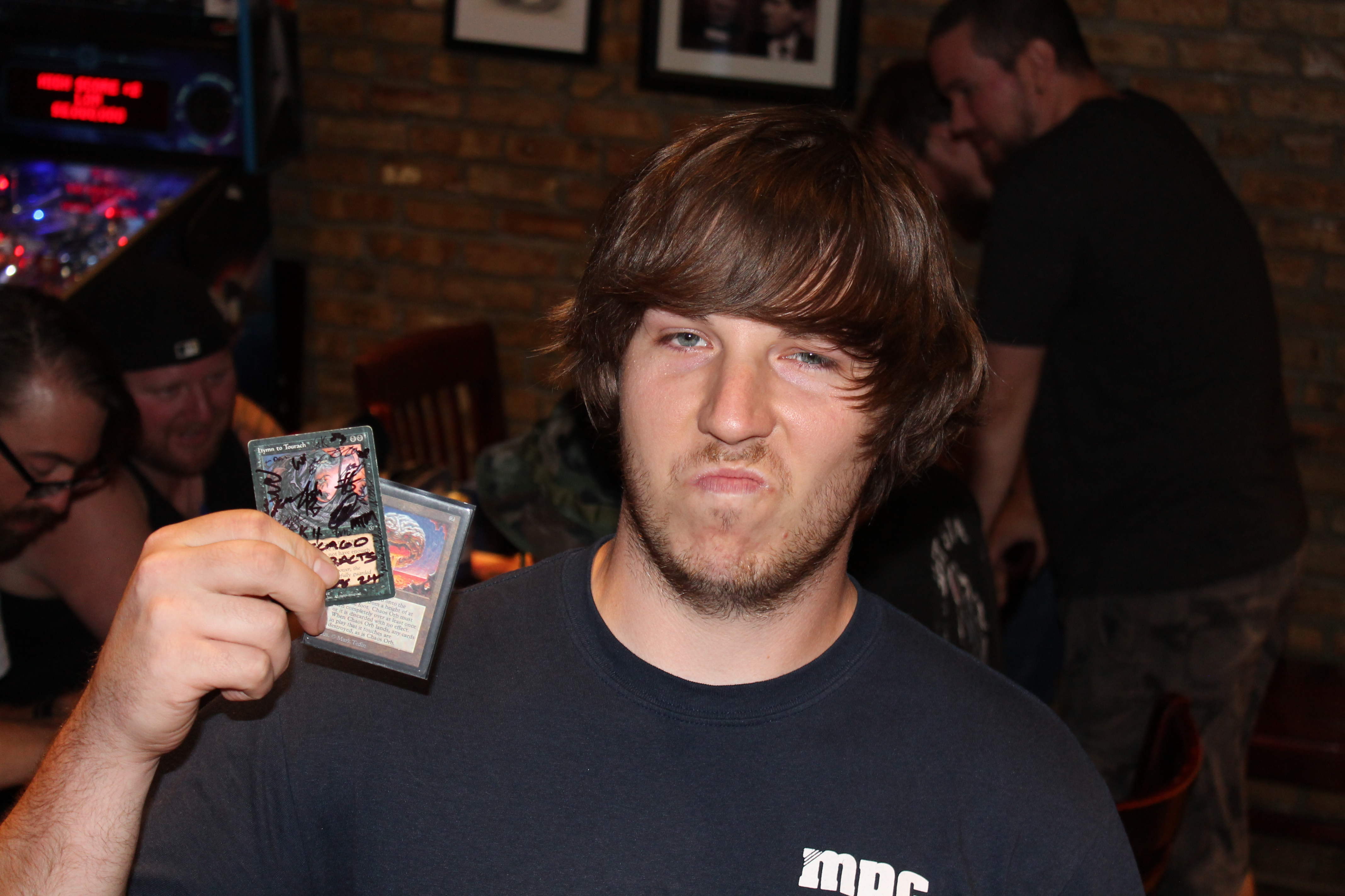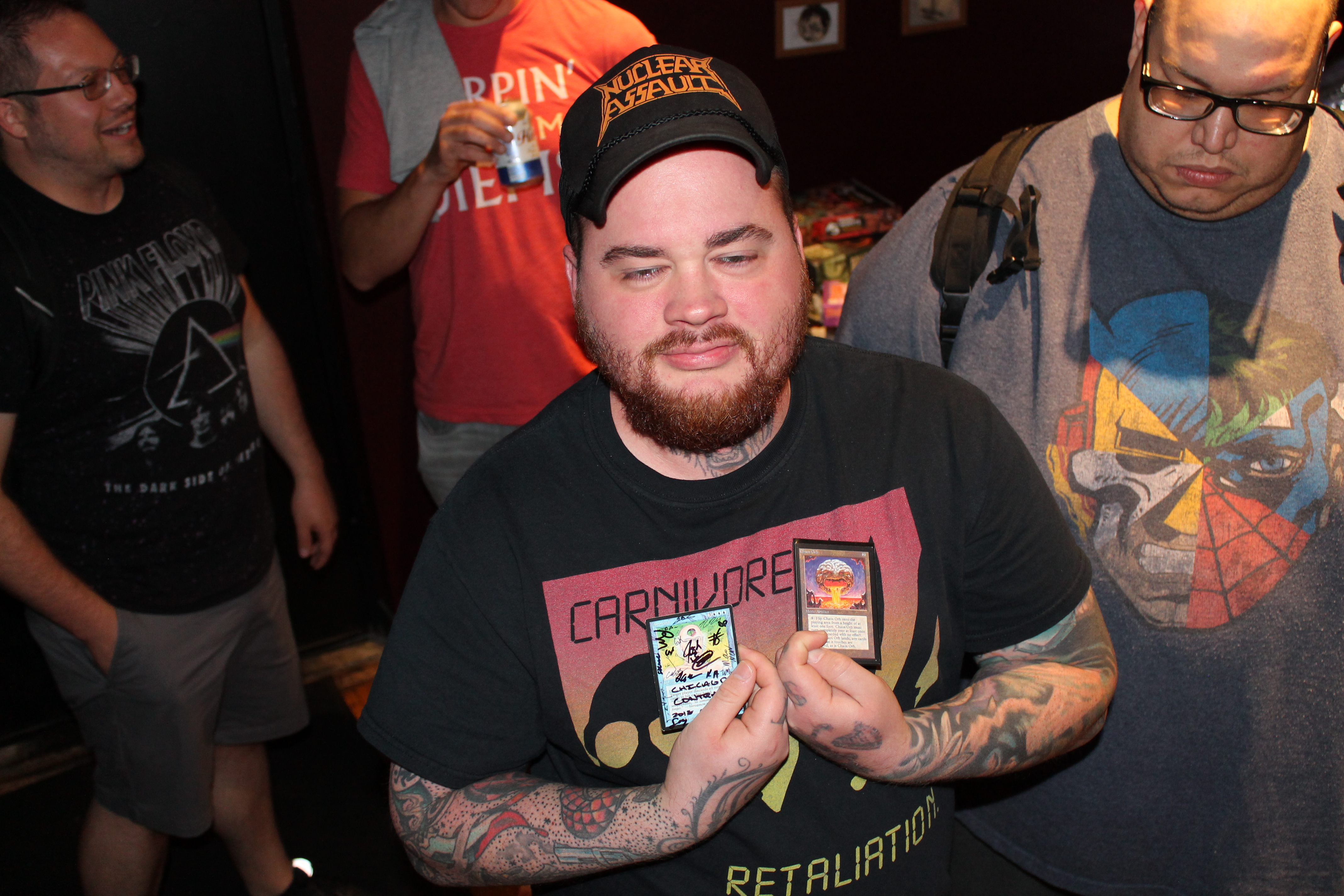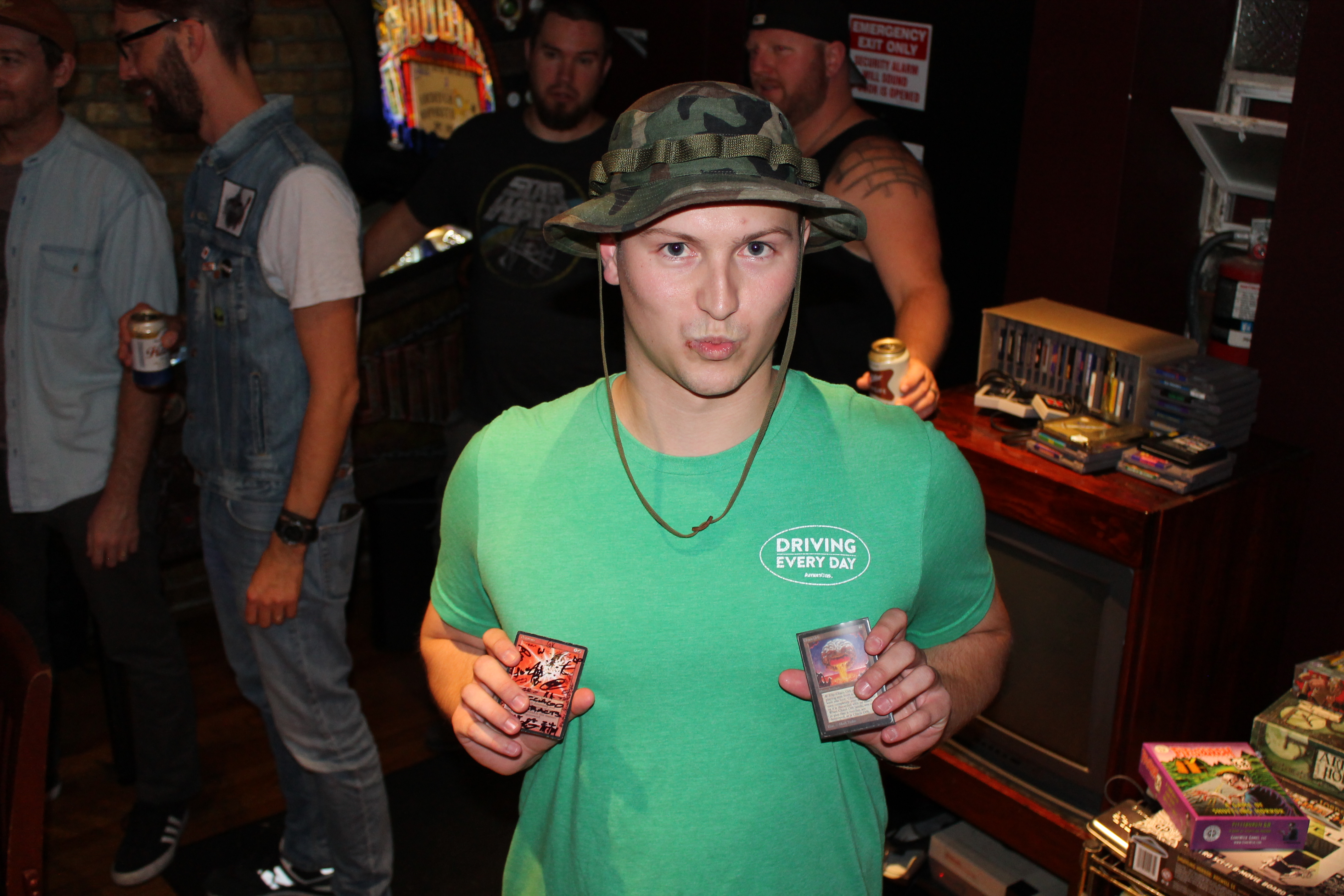 Later, I sat with Dan Ersch a.k.a. “Old School Dan” and asked if he wanted to borrow a copy of Contract. Yes, I’d packed three extra copies (signed, of course) to lend. “Sure!” he responded, “It’ll make my deck even better.” Oh shit, he was on Reanimator! One black mana to bin his dudes, Draw 7, and win the game. Dan put the boots to me and I don’t recall winning a single game, though Ydwen and Mijae nearly got me there once. After this the train derailed. During my three game set vs. Old School Dan, we loaded up on five, count ‘em, five Hamms + Kabanes. Cans and shot glasses littered the battlefield. Dan even double-Contracted me a game on the back of a Recall.