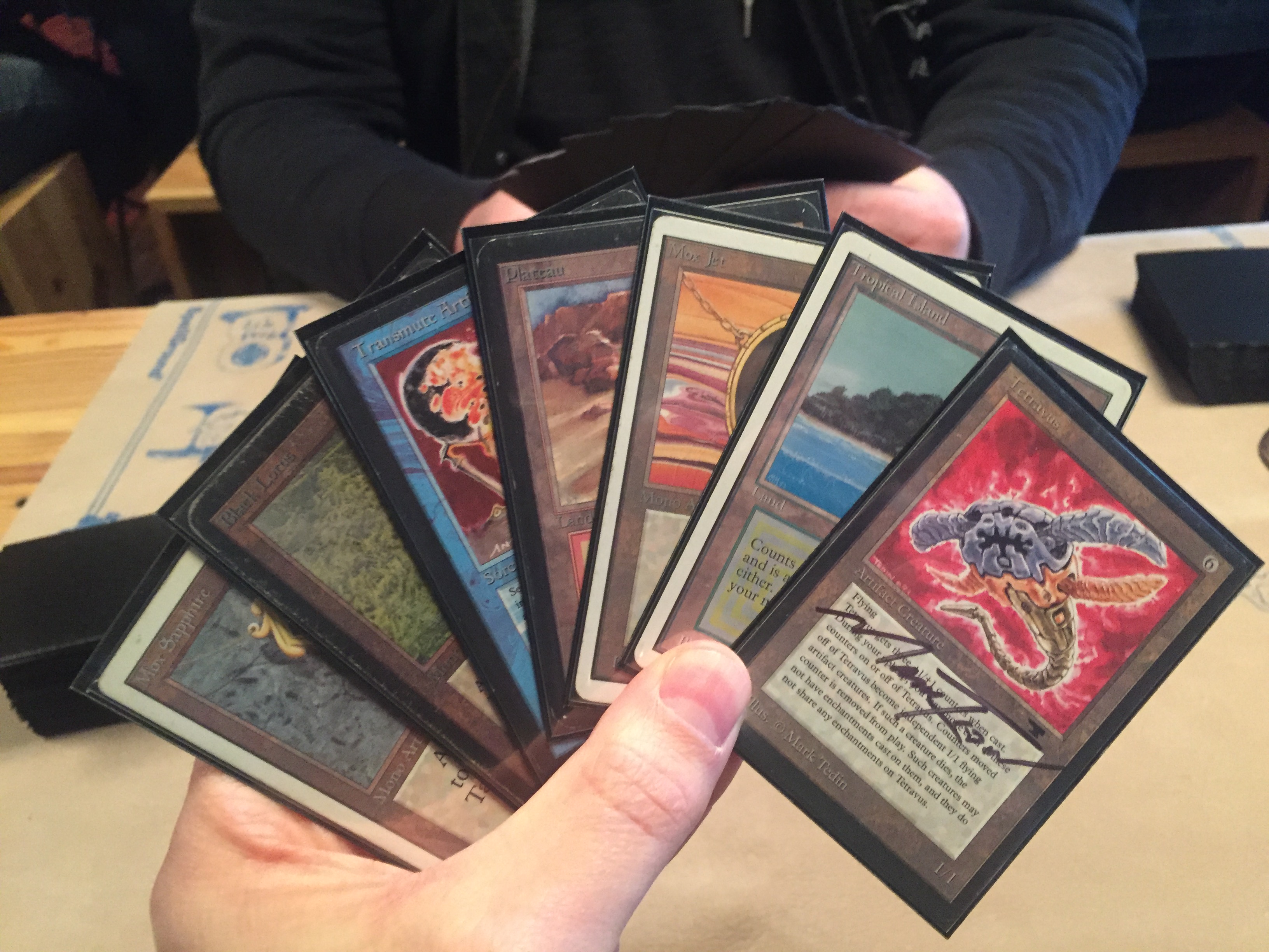 Game 1: Tyler opens with a Black Lotus and Taiga into an Atog and Sylvan Library, which is essentially him laying out his deck’s namesake and a card advantage engine to support it. My Plateau into Savannah Lion is immediately greeted on his next turn by a Lightning Bolt and Strip Mine. The Party Gods smile upon me as his Chaos Orb misses a White Knight I’ve resolved but we enter a creature stalemate. I manage to get a Preacher into play, which is often the answer to a stalemate. Preacher eats a Chain Lightning and he manages to feed an Atog at me over several turns where I’m forced to take damage or chump block. Either way things get bleak and your intrepid hero is domed by a Chain Lightning.