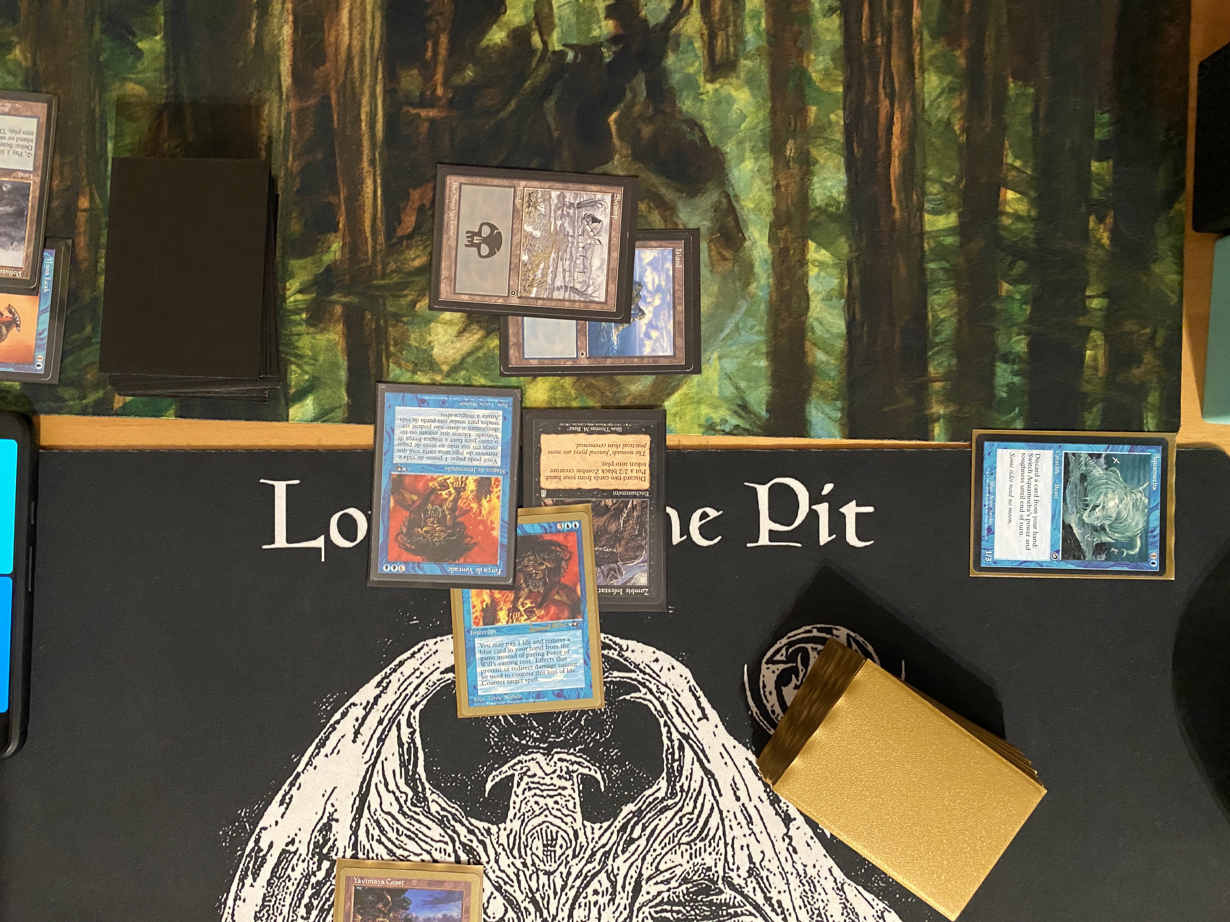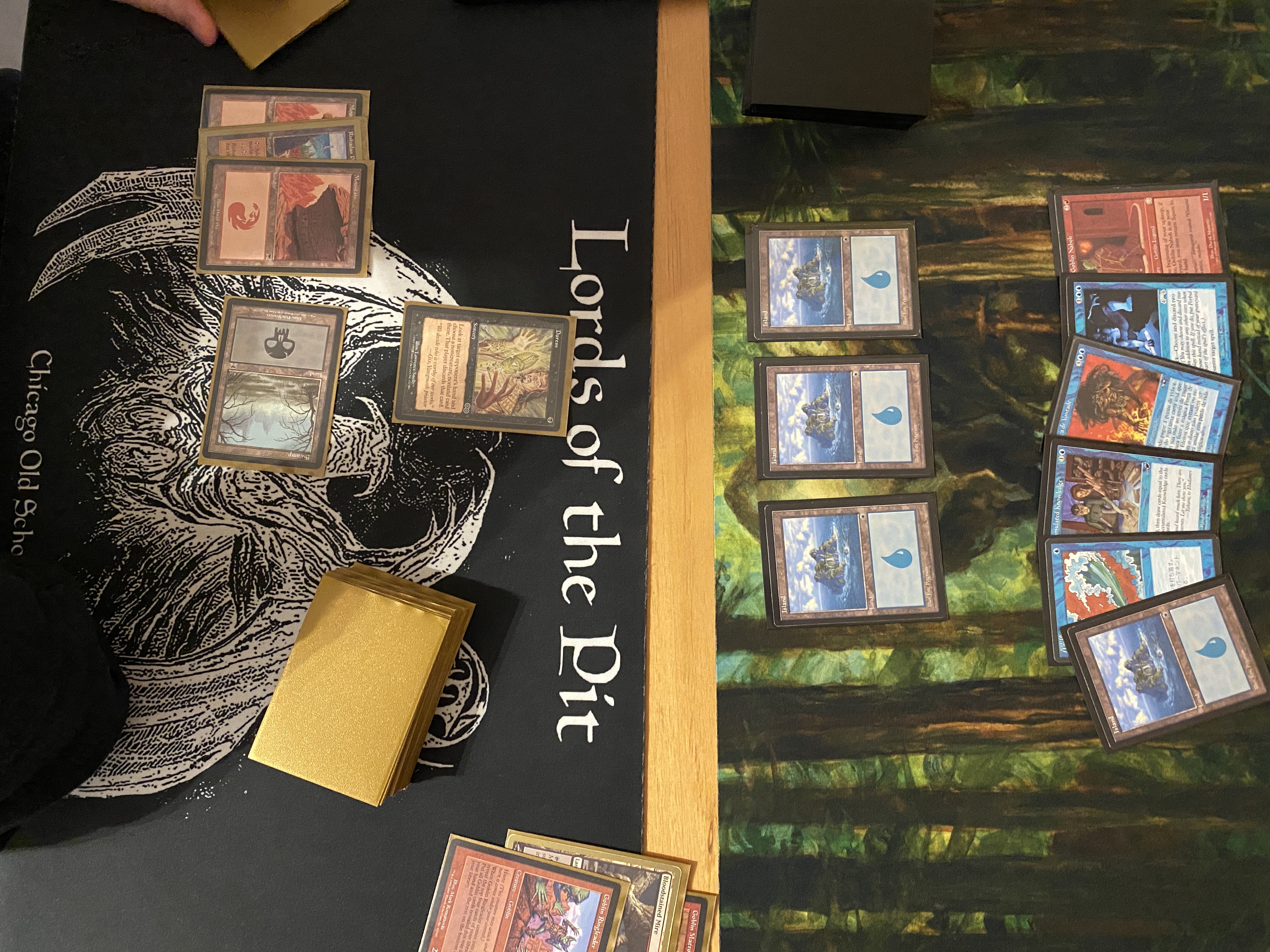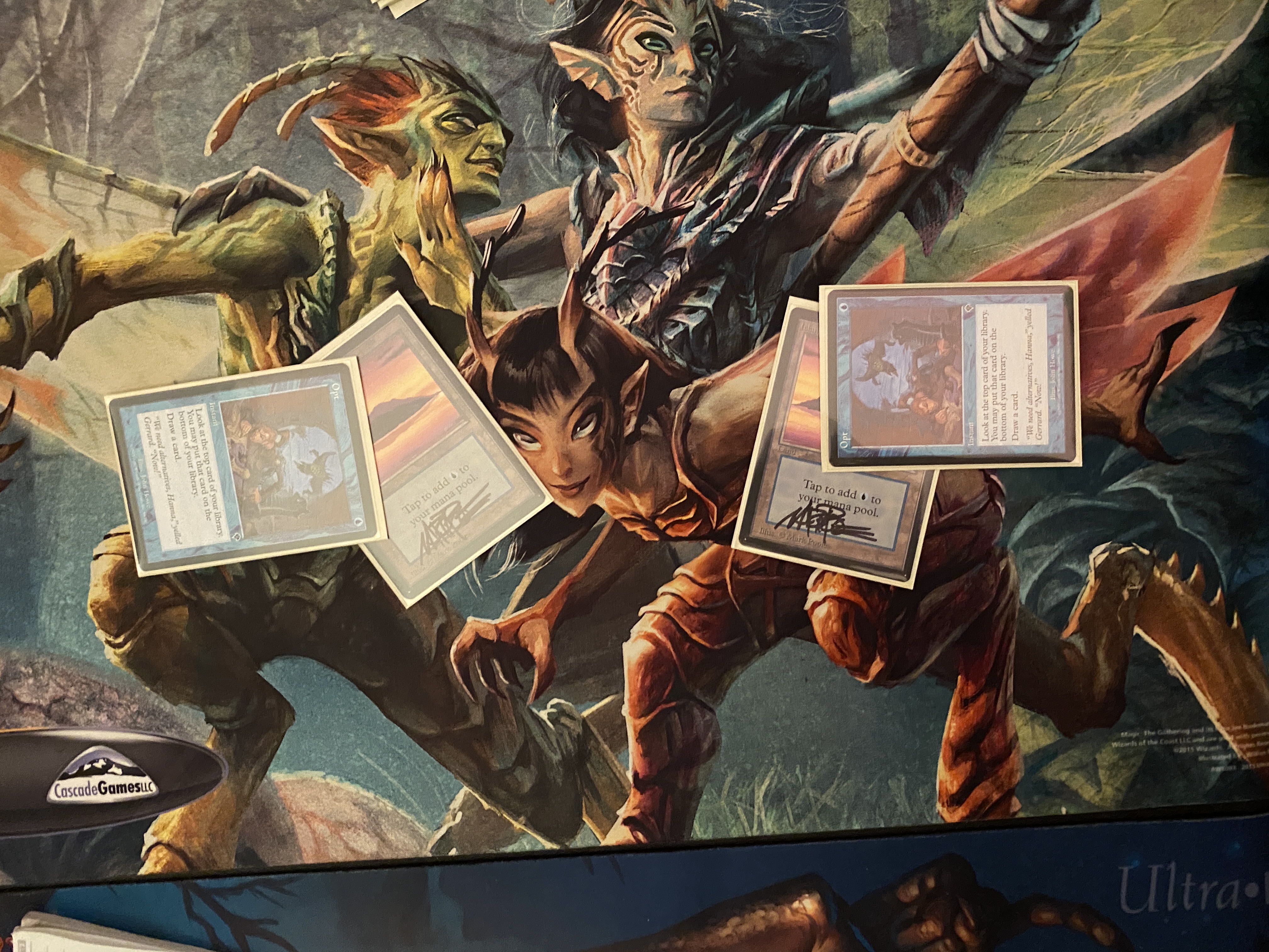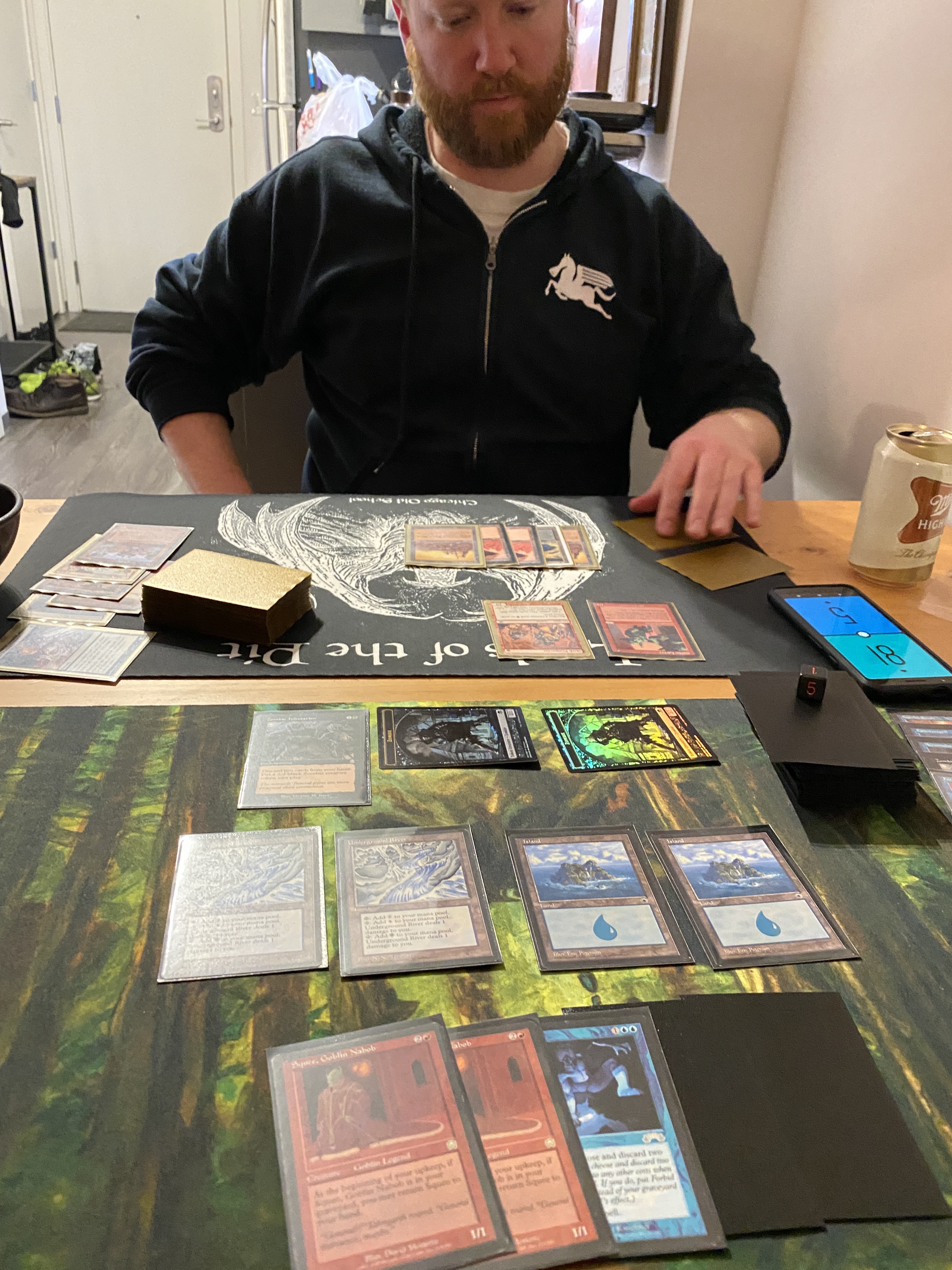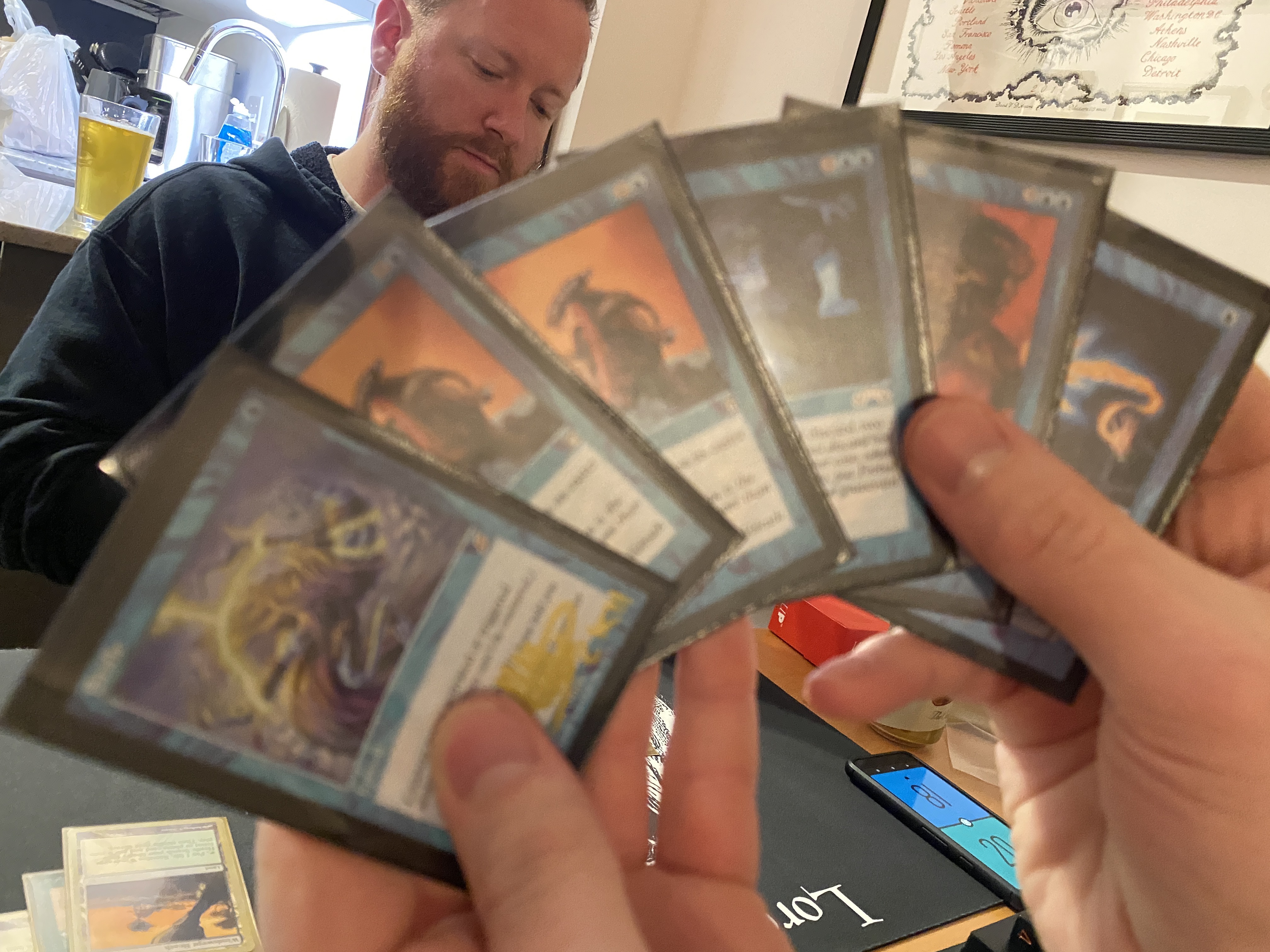 On the other side of the room, Carter, Bob, and Nathan are trying to figure out how Pioneer works. There are two identical Mark Poole signed Islands casting two identical copies of Opt.
