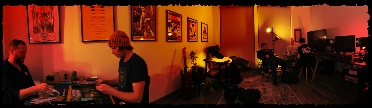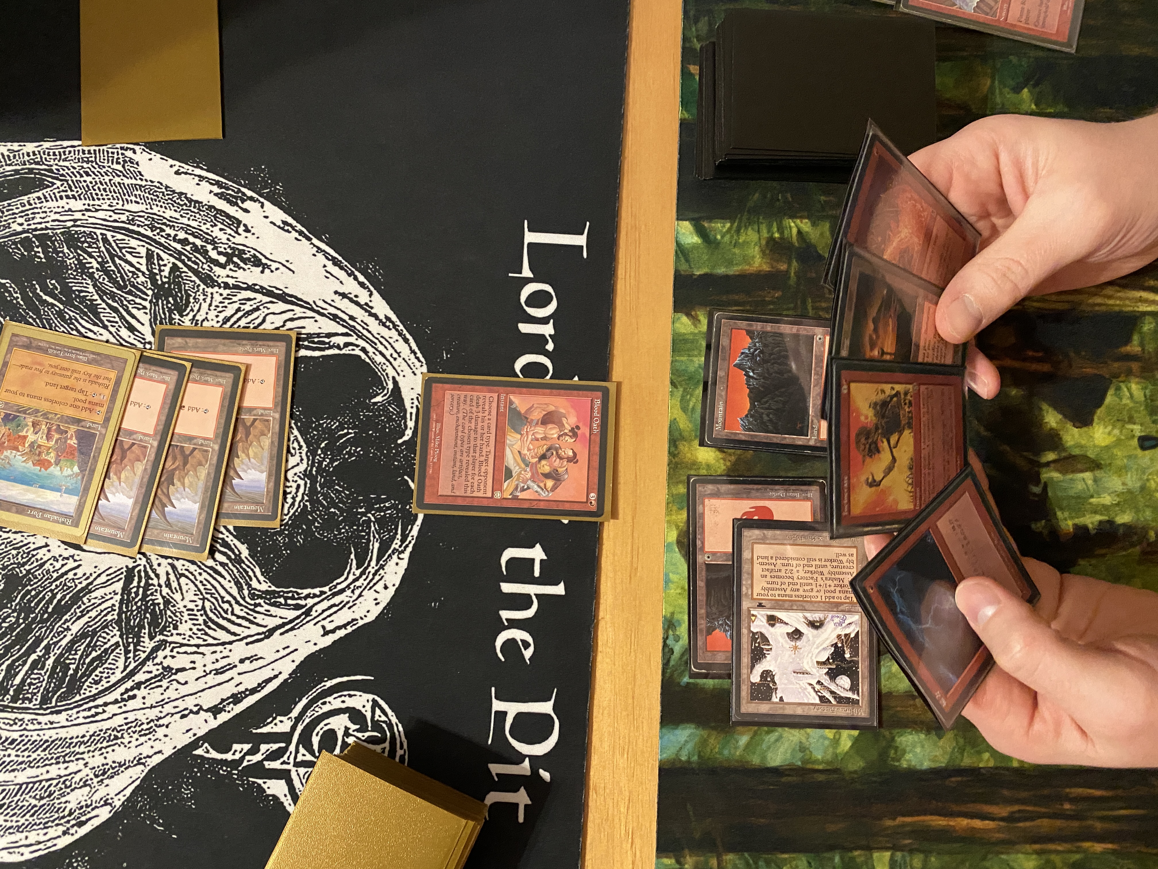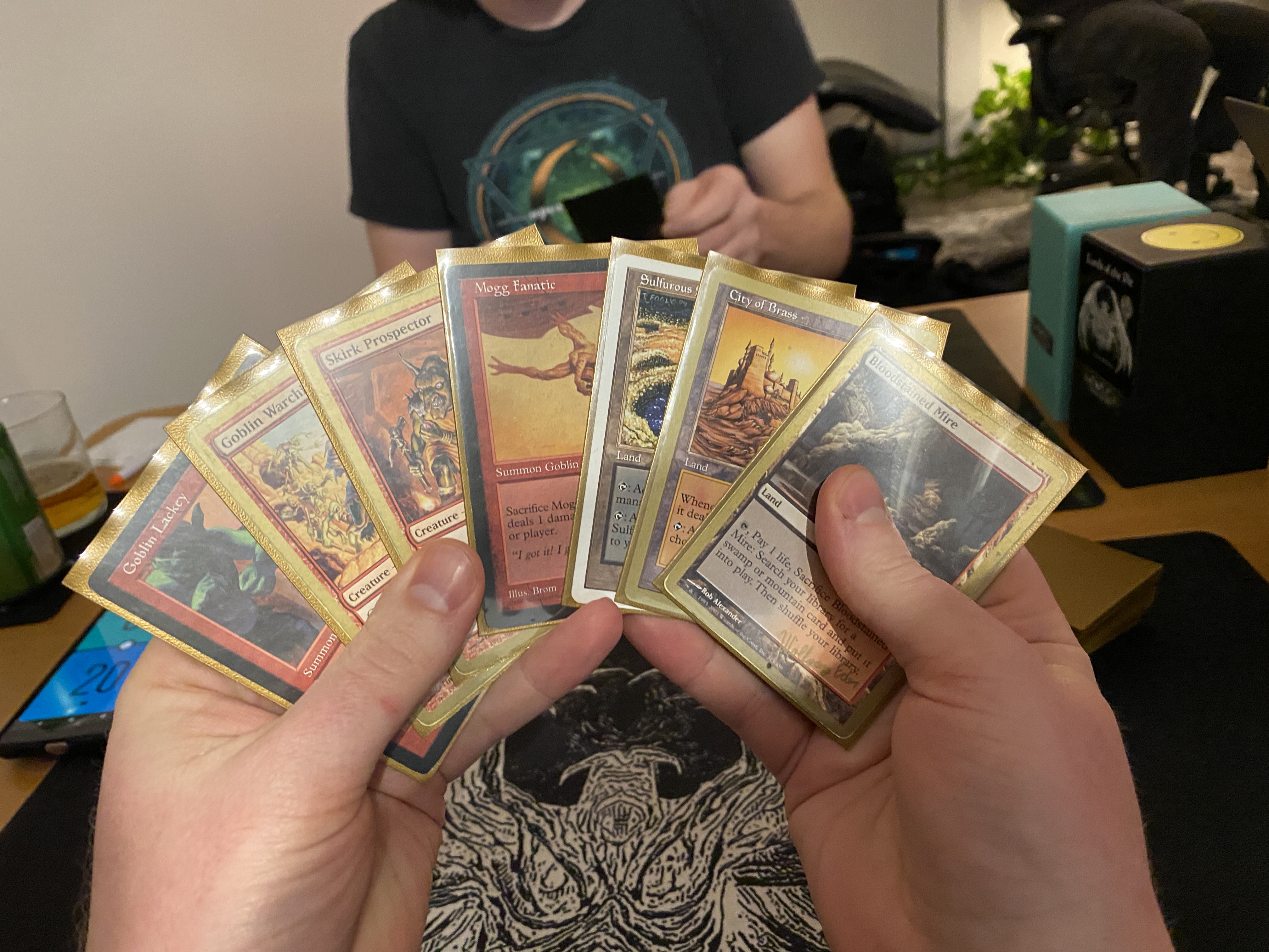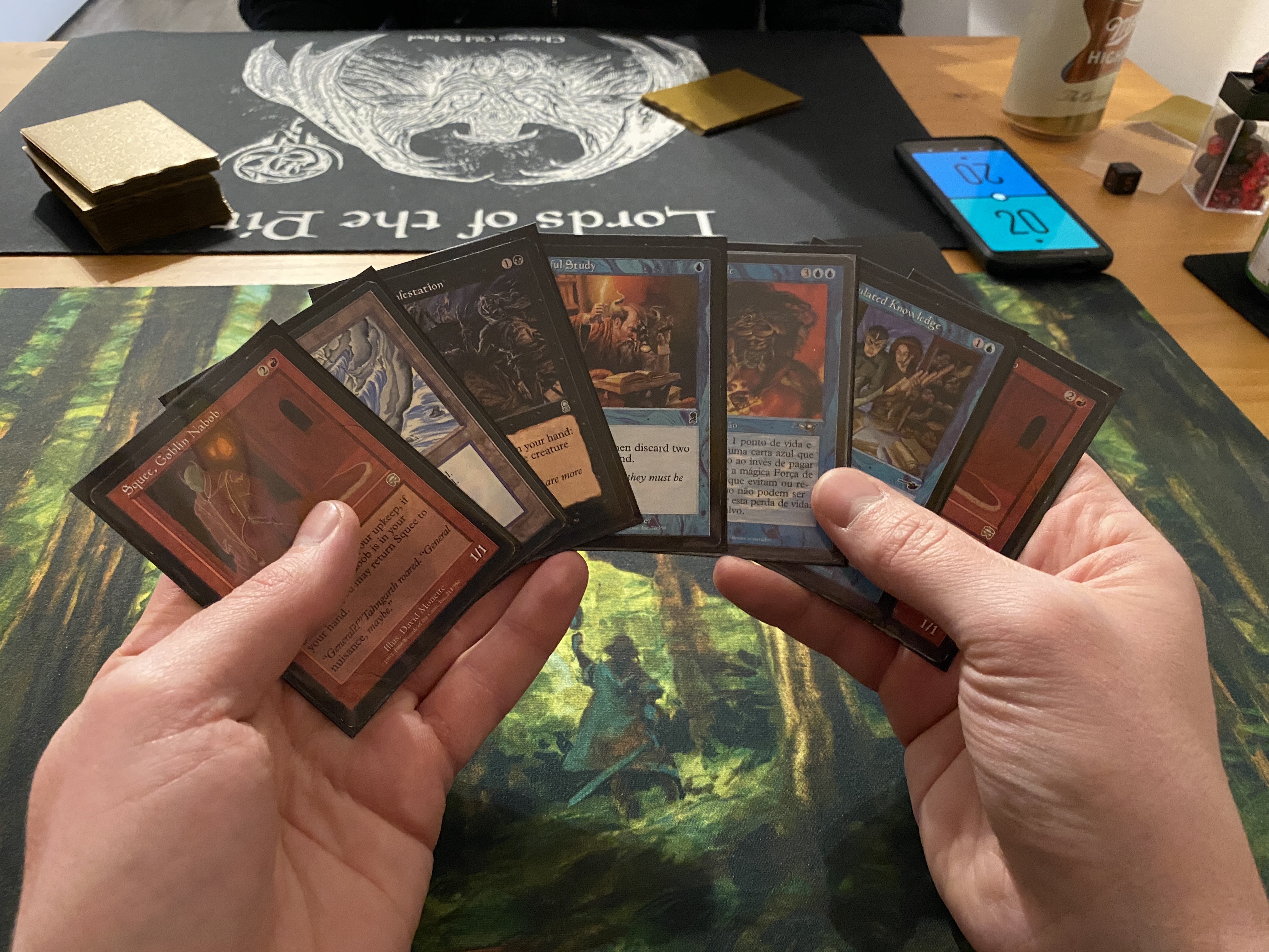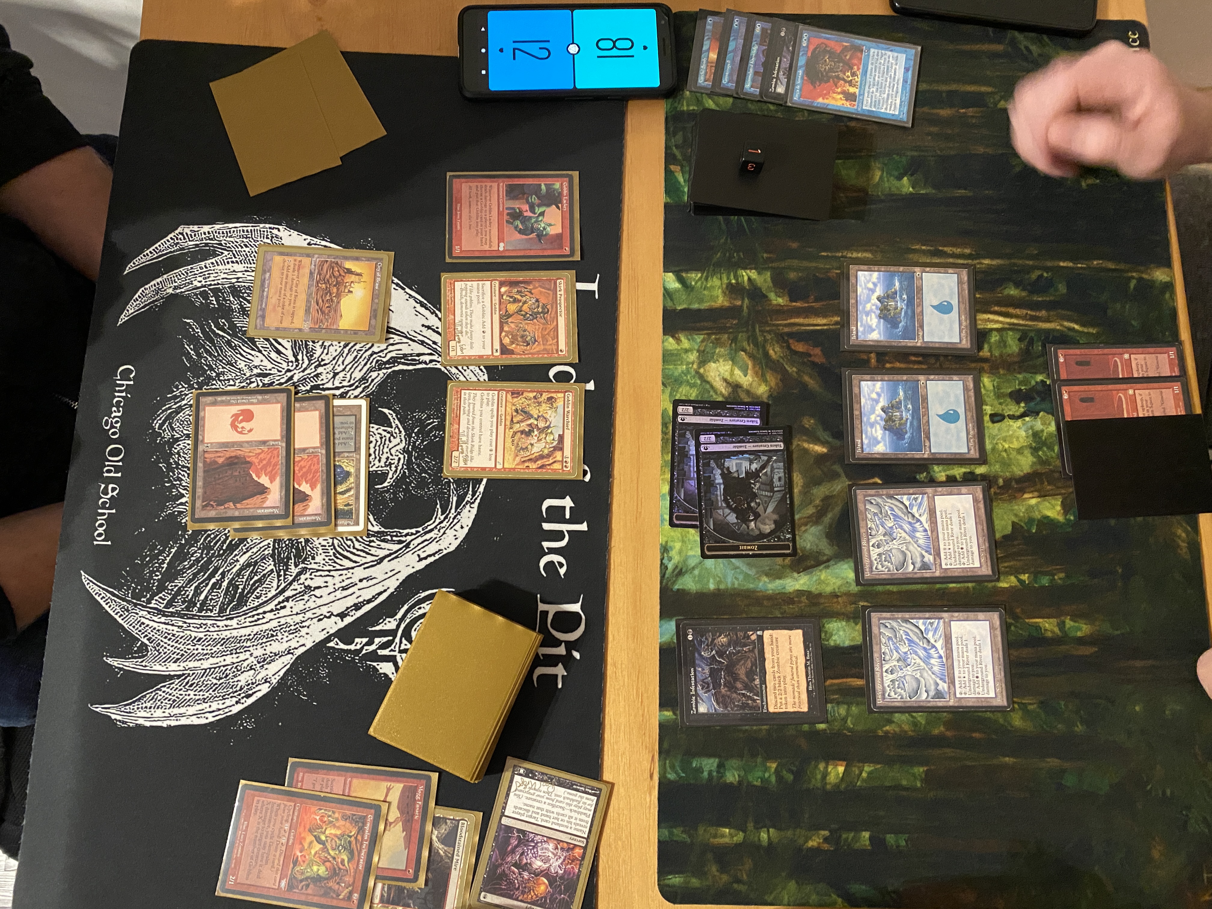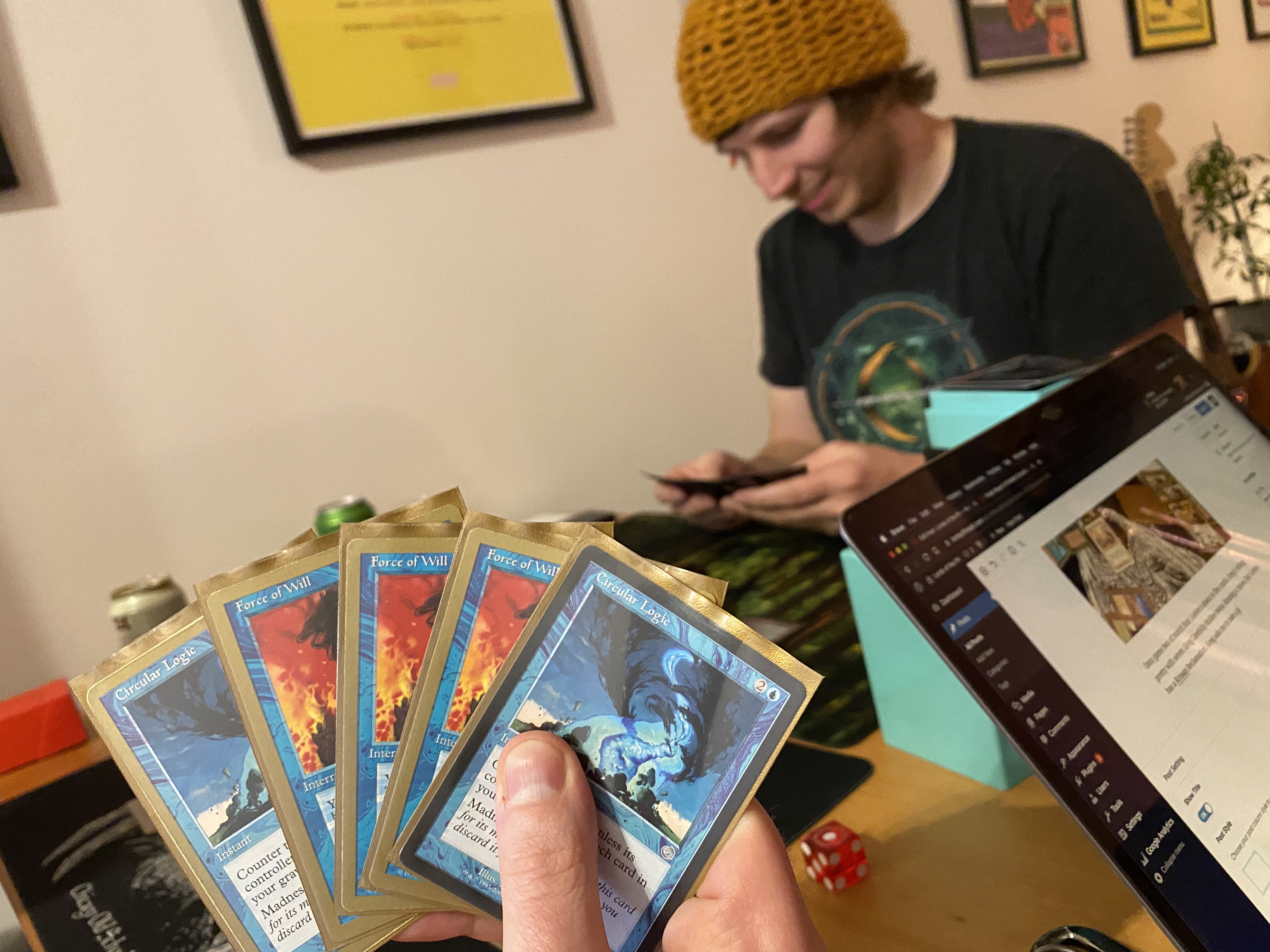 On the other side of the room, Carter, Bob, and Nathan are trying to figure out how Pioneer works. There are two identical Mark Poole signed Islands casting two identical copies of Opt.