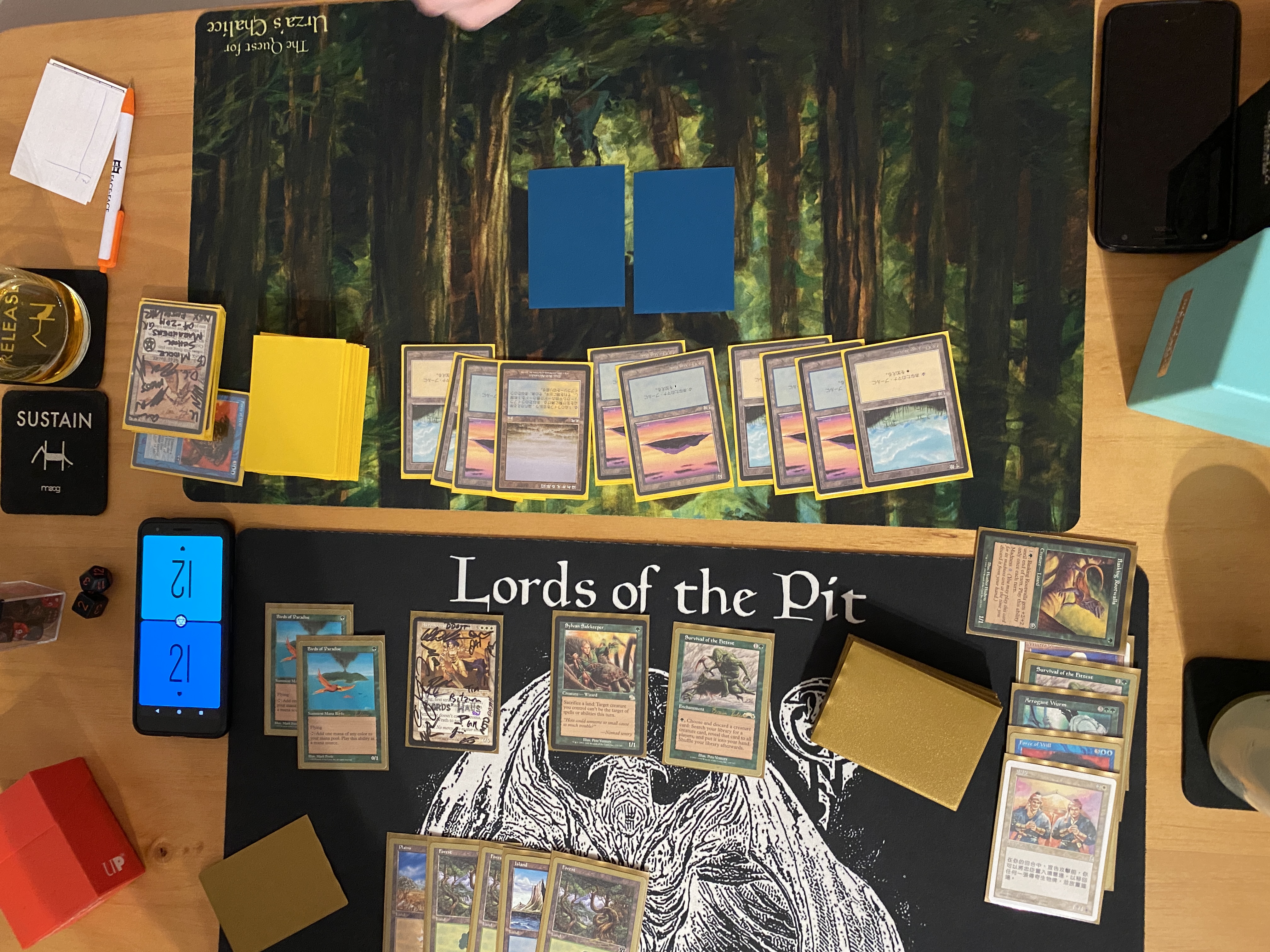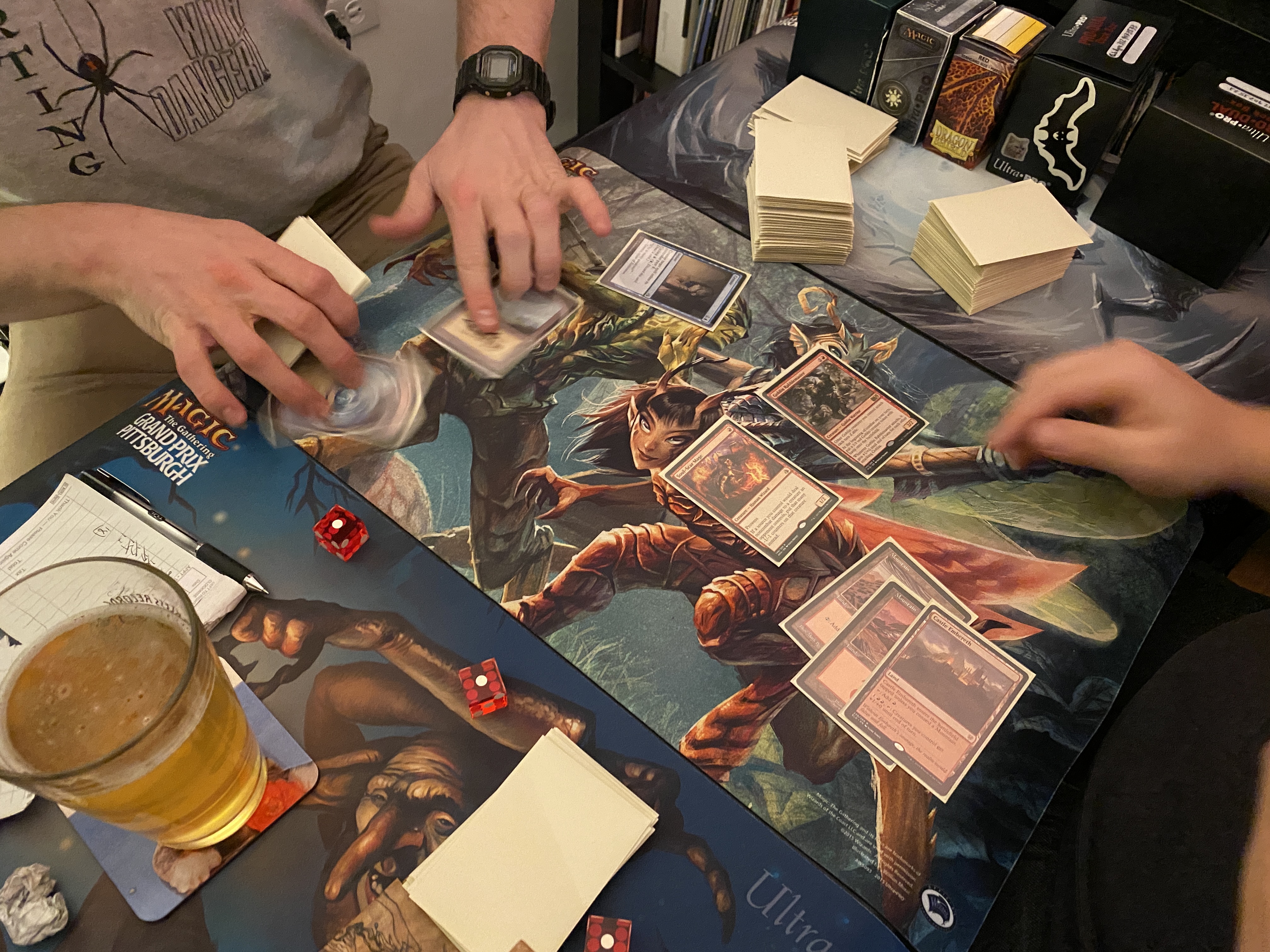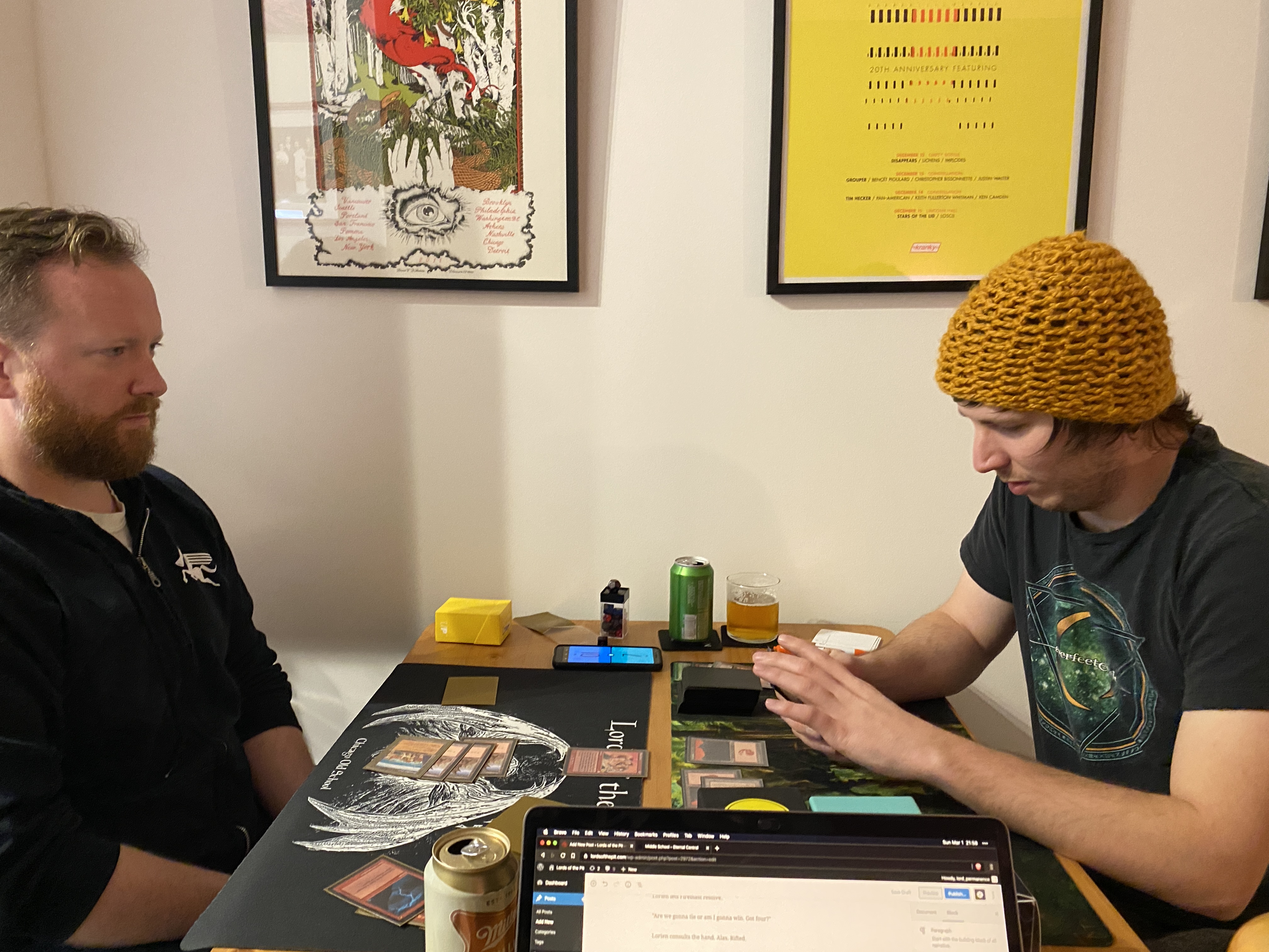 Both players text me their next deck choice. Greg was impulsive. He’s running the same zombie deck again. Lorien contemplates for a long time before deciding on swinging back to Bant Survival.