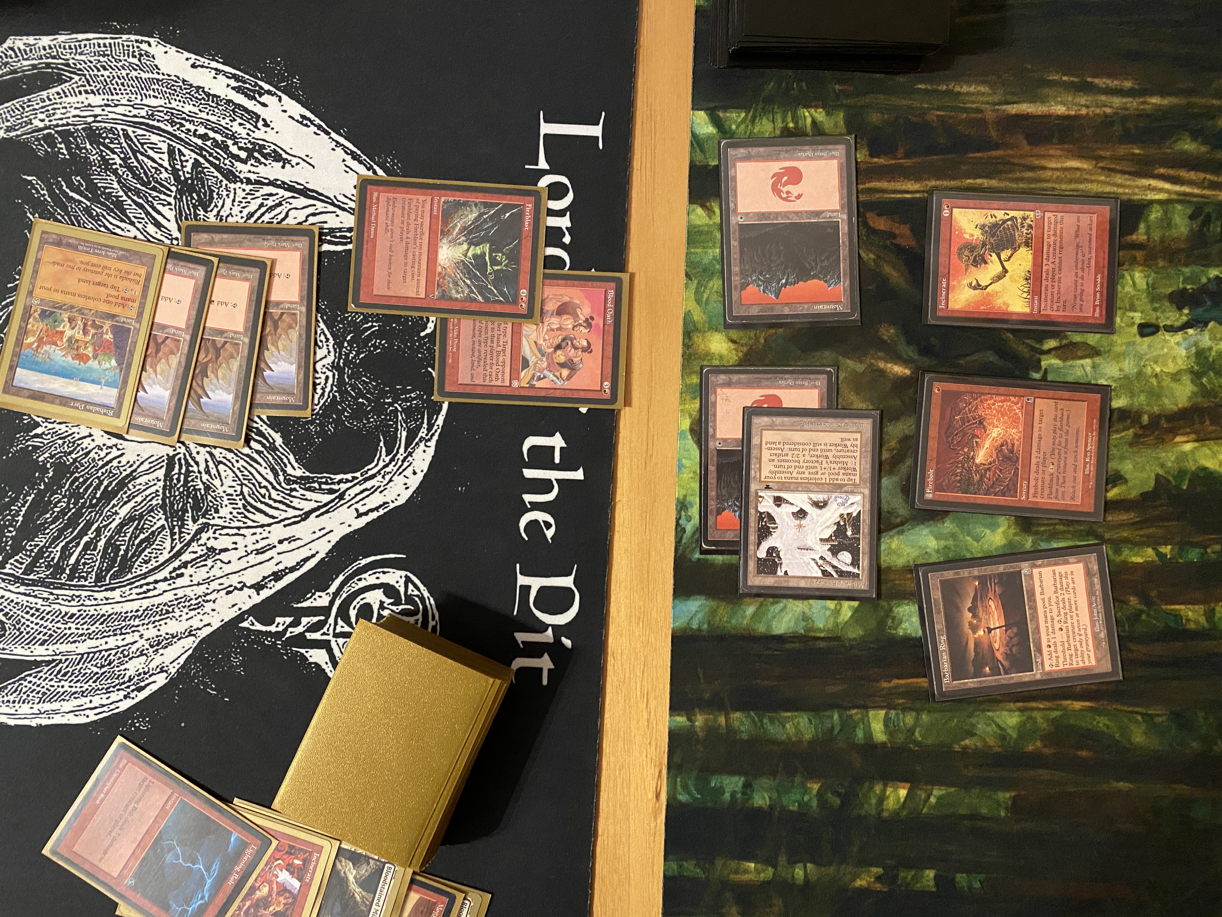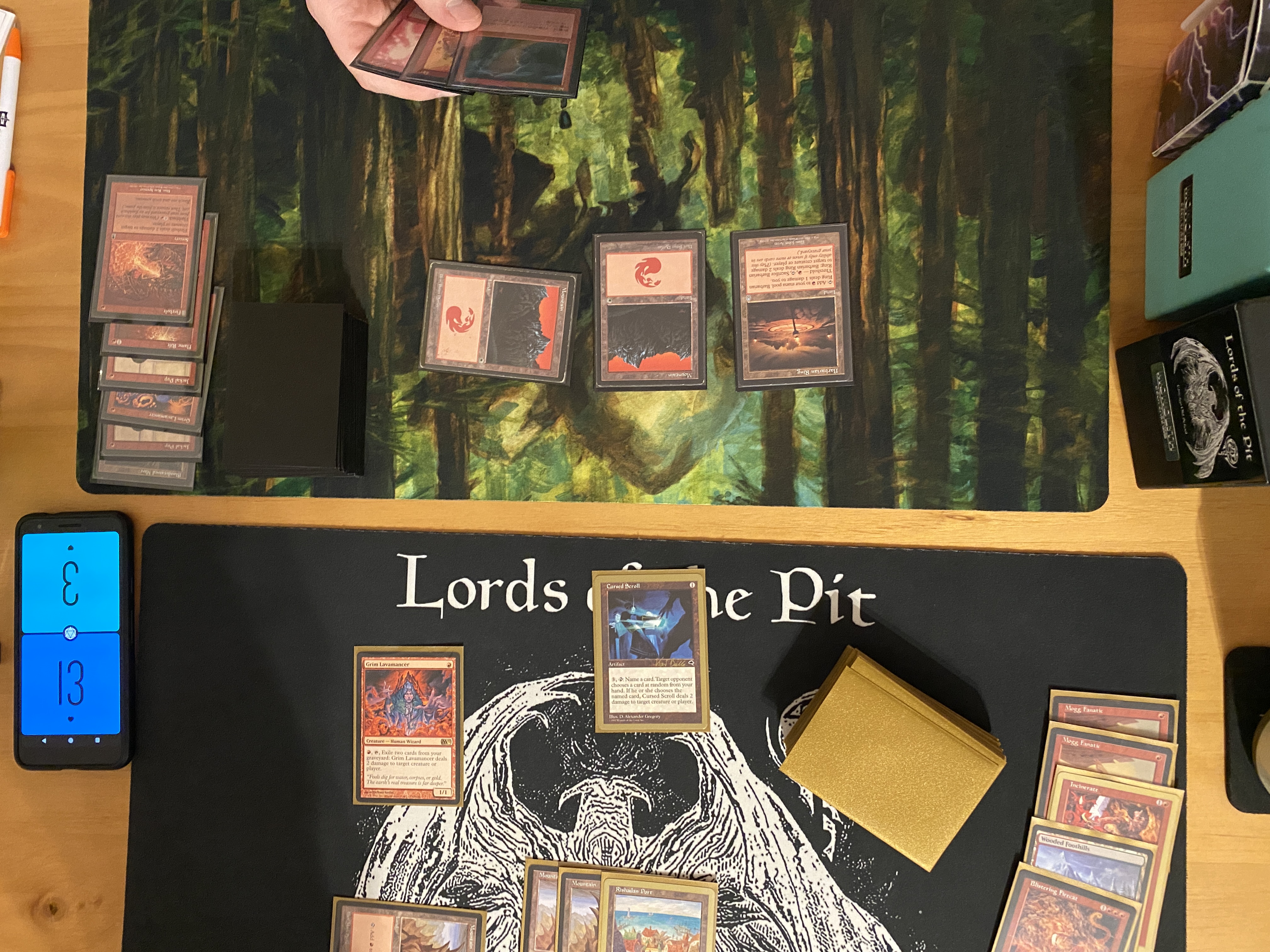 Game three, match two. We’re on turn three and there is a Mogg Fanatic and a fetch in each graveyard. Greg fires off an end step Incinerate and then follows it up with a winter Factory (big mood in a mono red deck) and a Flame Rift. Lorien fires back with an Incinerate and a bolt. This time score is ten Lorien, seven Greg.