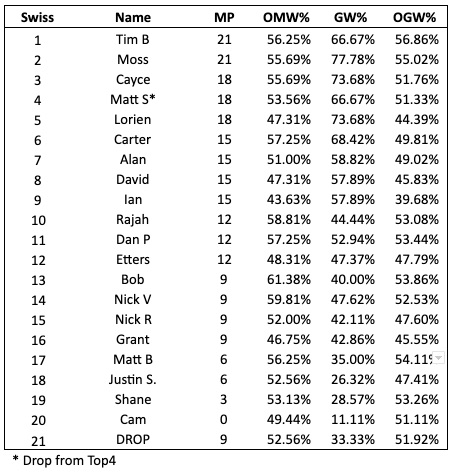 Batch 1 consisted of four matches of randomly-paired EC 93/94. Batch 2 followed with four rounds of Middle School with pairings based on records from the first batch. After the batches, the top four players revealed their deck lists and ran back their OS brews to determine the champion. The event culminated with hometown hero Lord Ellemen on an Esper-midrange deck battling southern boy Cayce Grissom on RUG Aggro. Thanks to Big Brain Bob’s technical prowess, the Lords gathered in a virtual Discord room for happy hour and live spectating. This was our virtual answer to recreating the gathering around the finals table to root for a hero of choice with friends. (Or to slander them both!) After two tight games, Lorien bested Cayce to defend the club and earn the crown.