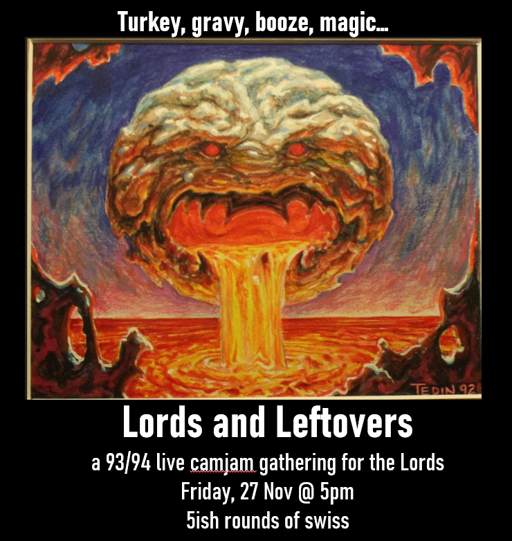 Nuked turkey, soggy stuffing and lumpy taters are the staples of any good Thanksgiving leftover feast. Because it’s 2020, the Lords of the Pit added roast unicorn to the mix with our Lords & Leftovers challenge on Black Friday eve. Fifteen LOTP met in the virtual squared circle to find out who their most festive fighter was. For one night only, Feast of the Unicorn, that oft-overlooked black Homelands Aura blessing a creature with +4/+0, was legalized. The Lords once again supported the Greater Chicago Food Depository as their charity of choice for the event.