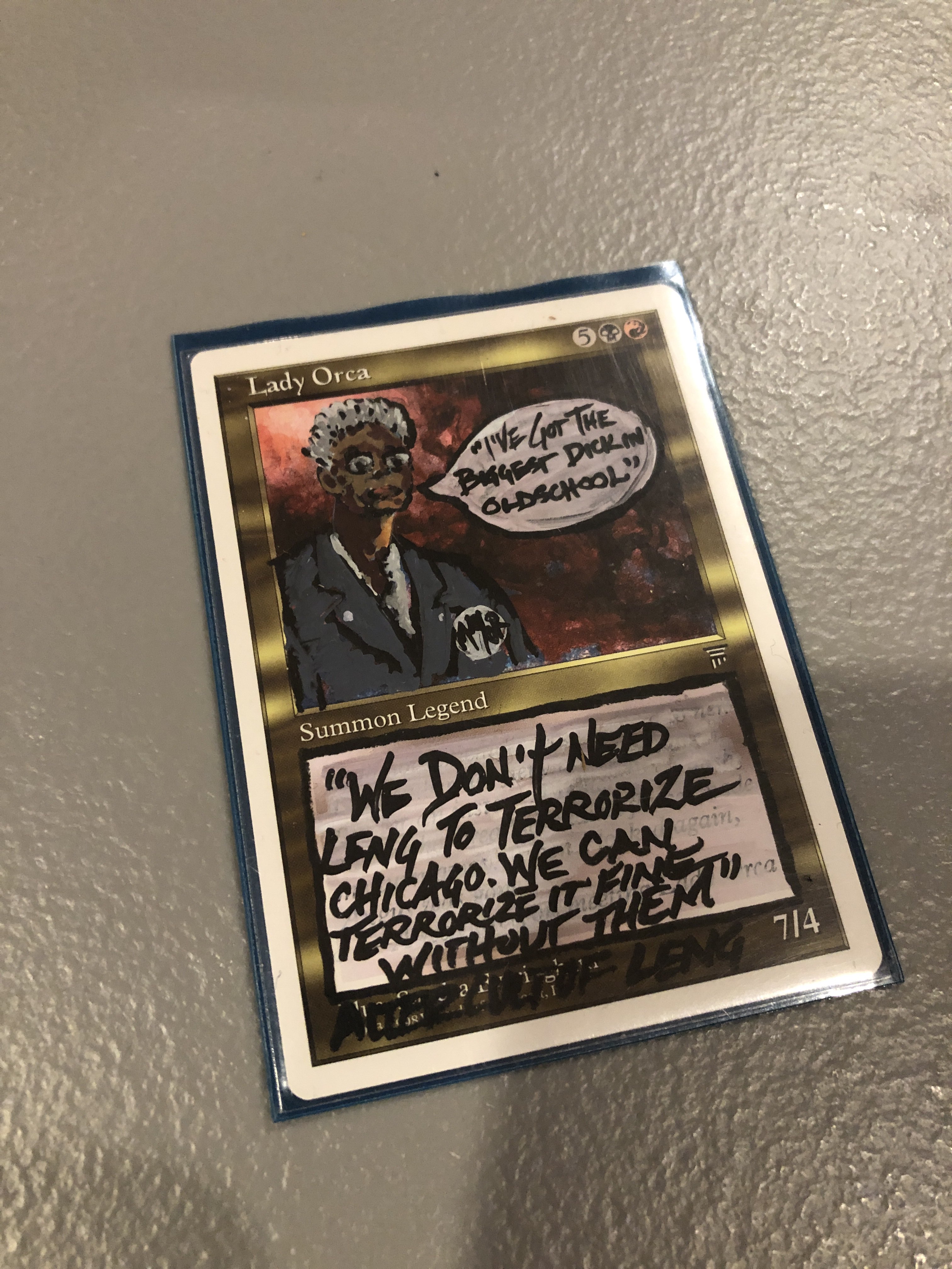 Moss turned his hat around and gave me a look straight out of Over the Top. He was letting me know that he was Sylvester Stallone, and I was about to have my arm ripped off. If I even had arms. I looked down and discovered that I did. I looked back up, and he had hardly moved. His hat in the proper position. He placed the measuring device on the table, and I broke out the Lori Lightfoot “Biggest Dick in Oldschool” Lady Orca for a target. The Rocky montage of Moss flipping for his patch started playing in my head. He presumed victory. It was coursing through his veins.