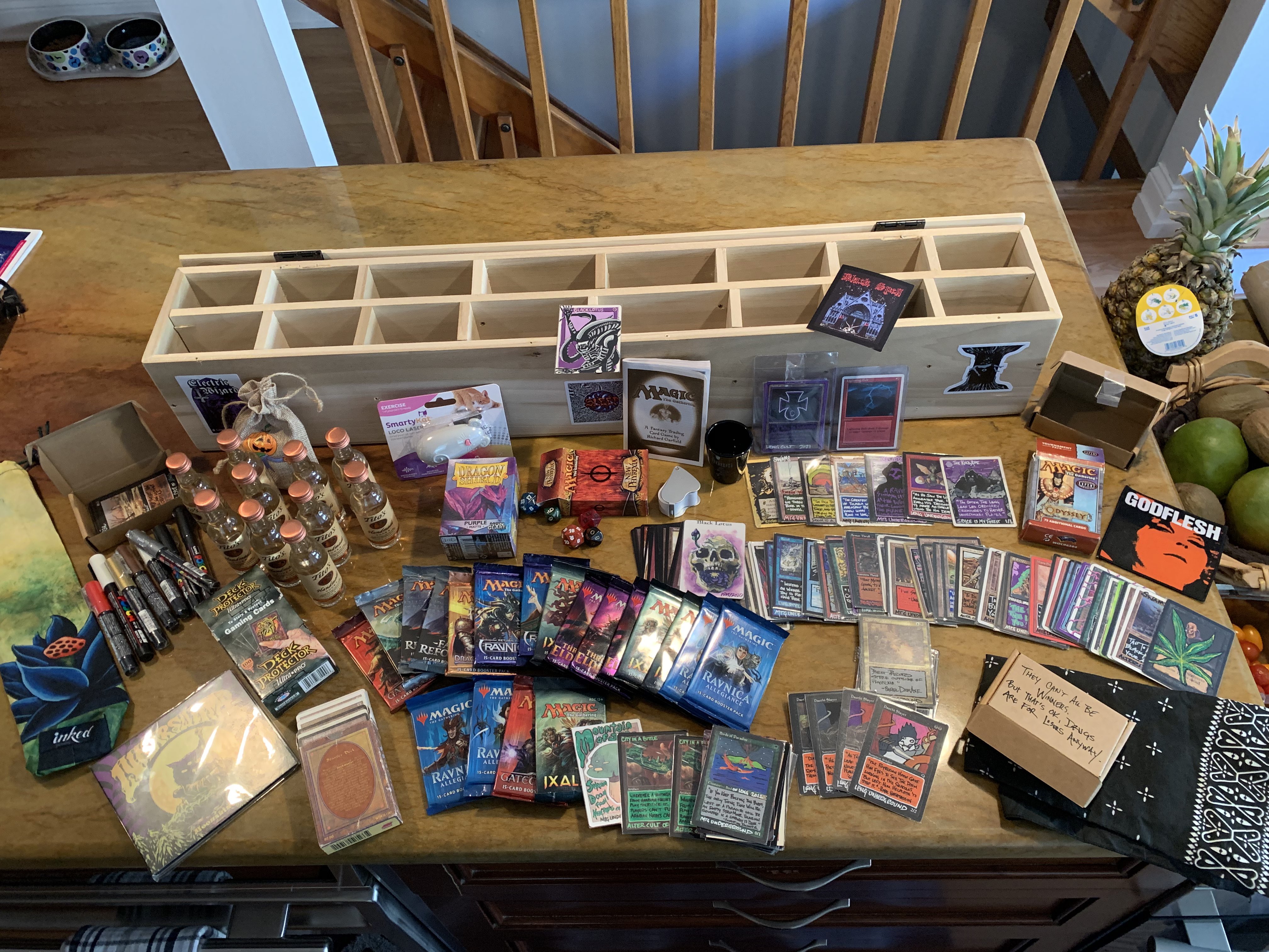 I have had two years without the usual if sporadic gatherings, so I have been denied the chance to give away things that I accumulate. I found myself with an abundance of ephemera and oddities, along with a heavy mix of alters, packs, alcohol, shot glasses, cat toys, and whatever else I could find about the library. It was a treasure trove fit for Old School, but it did not feel like enough.