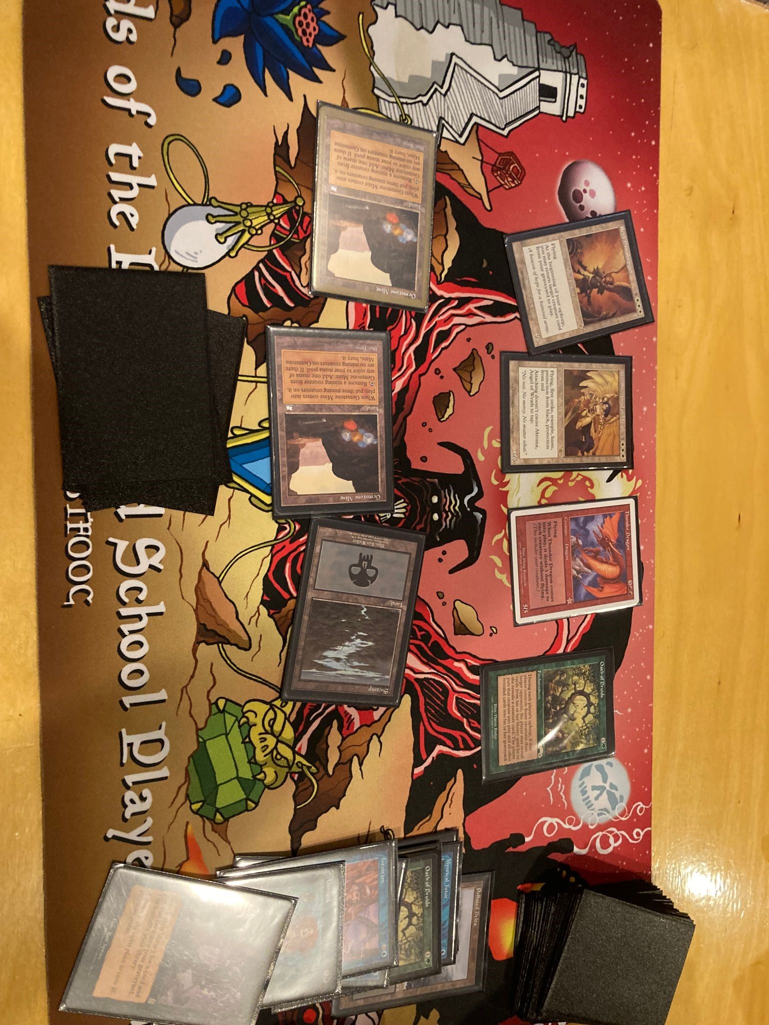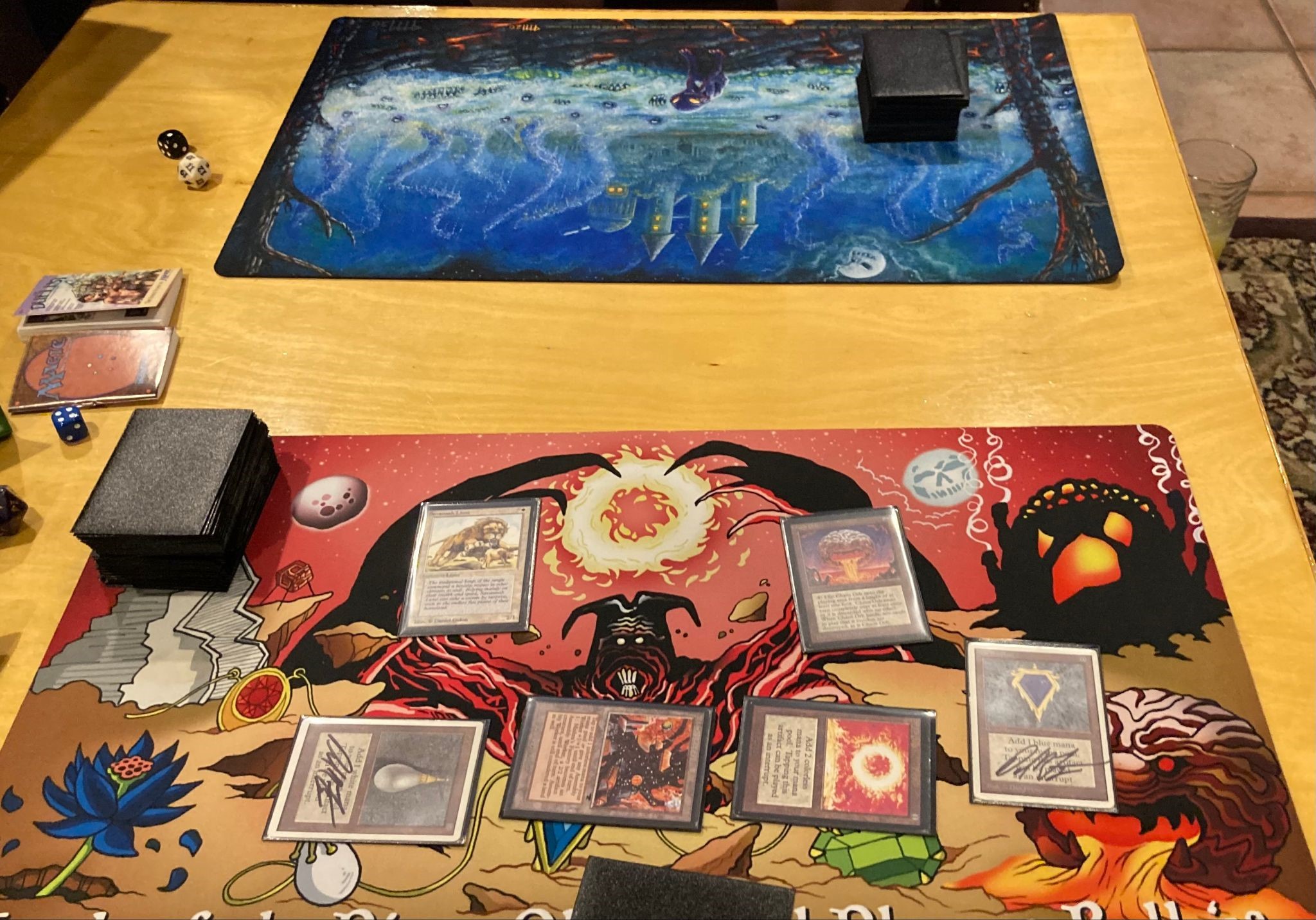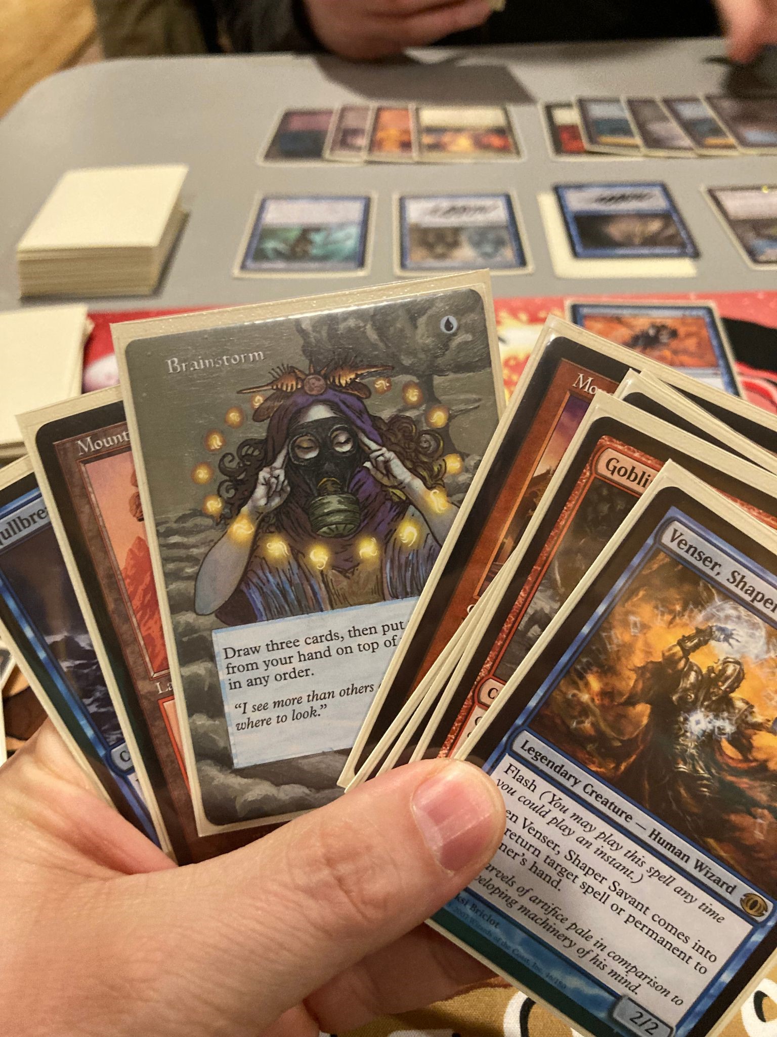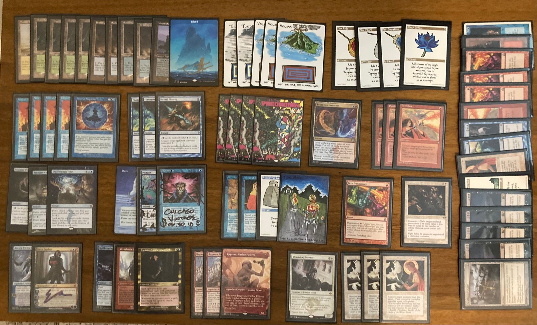 I love Vintage. It’s just so powerful and stupid. Turn 1 may bring a million questions of the right line. This was my first time in a Vintage “event” since LH1. Ninteen players scraped lists together on Saturday morning to jam the most powerful format. I picked cantrip.dec because it’s an archetype I know and enjoy, and Pyroblast seems pretty good against all the broken blue Tinker shenanigans. I picked up four copies of offensive looking Preordains (some experts consider it the best card in Vintage) to troll the crowd. I enjoyed getting to play with some new old border cards… though I really missed the mark on forgetting to upgrade Dack. Moss gifted me an (Avon) signed, un-bordered Island to mark our use of the land to troll folks since its release. It slotted right into the list.