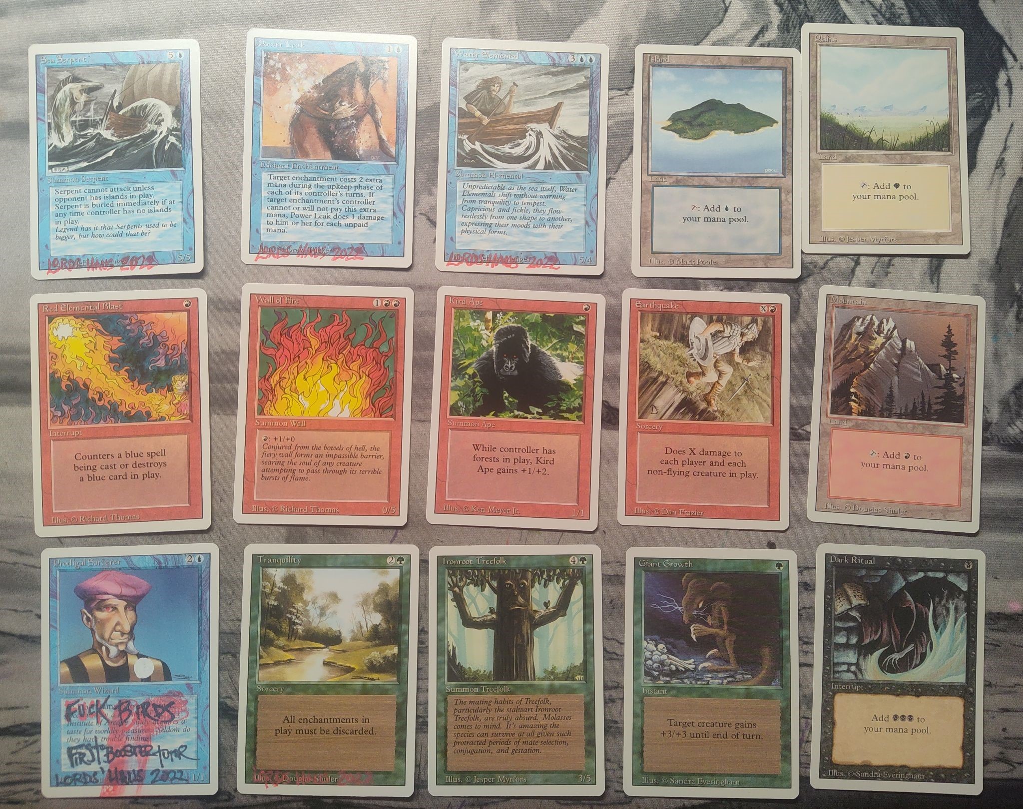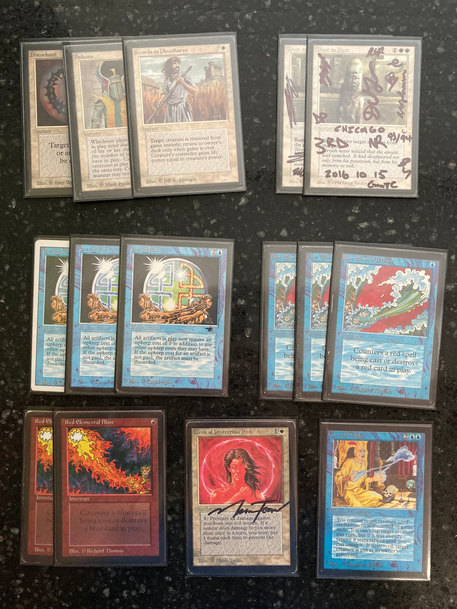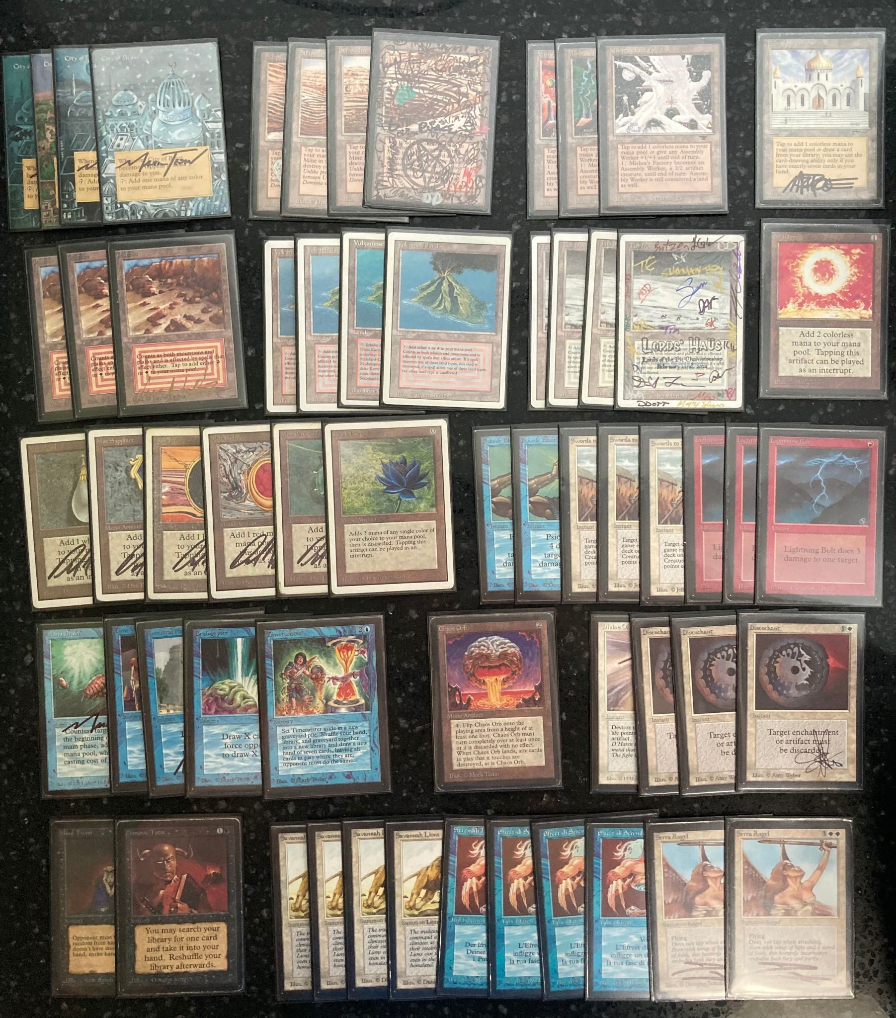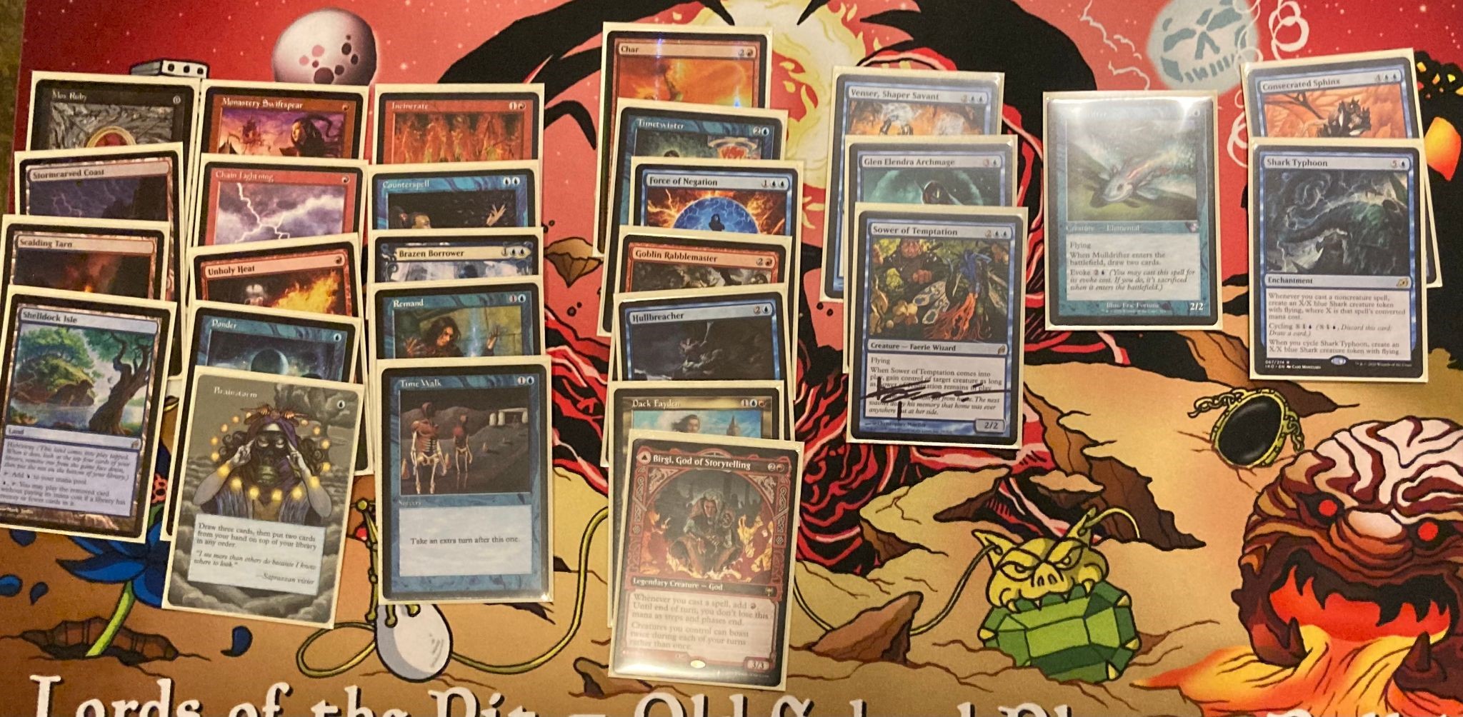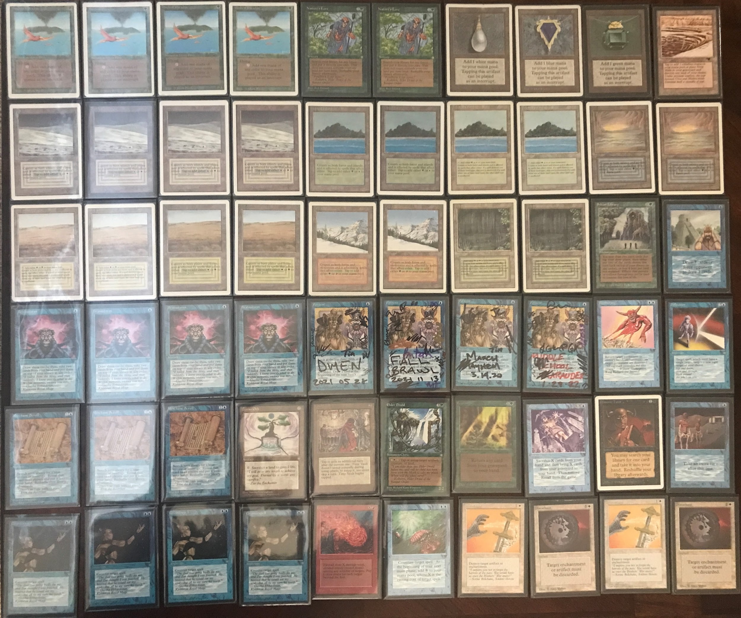 I love Vintage. It’s just so powerful and stupid. Turn 1 may bring a million questions of the right line. This was my first time in a Vintage “event” since LH1. Ninteen players scraped lists together on Saturday morning to jam the most powerful format. I picked cantrip.dec because it’s an archetype I know and enjoy, and Pyroblast seems pretty good against all the broken blue Tinker shenanigans. I picked up four copies of offensive looking Preordains (some experts consider it the best card in Vintage) to troll the crowd. I enjoyed getting to play with some new old border cards… though I really missed the mark on forgetting to upgrade Dack. Moss gifted me an (Avon) signed, un-bordered Island to mark our use of the land to troll folks since its release. It slotted right into the list.
