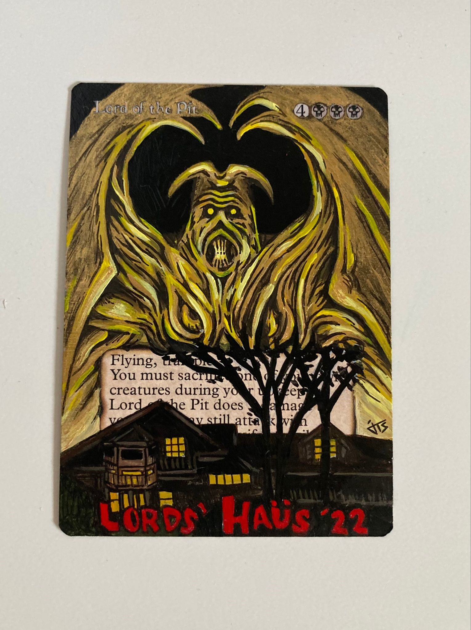 I love the Lords Haus tradition, adopted from Team Serious, that each person brings a prize for the community prize pool after the main event. It’s more like a defacto gift exchange and as such creates a very personal feel. People Brought things meaningful to them to share with others - special cards, homemade mystery boxes, music, art, booze, A GRADED PACK OF LEGENDS, etc. Mrs. Punts not only supported me ditching my family responsibility to play cards for several days, but she created two little works of art. The first was a contribution to the prize pool, memorializing my favorite new way to jam games with a more format-appropriate “Demonic” Booster Tutor. The second was the return of the Golden Lord for the 93/94 Champion. Tons of amazing stuff was arrayed on the grand piano.