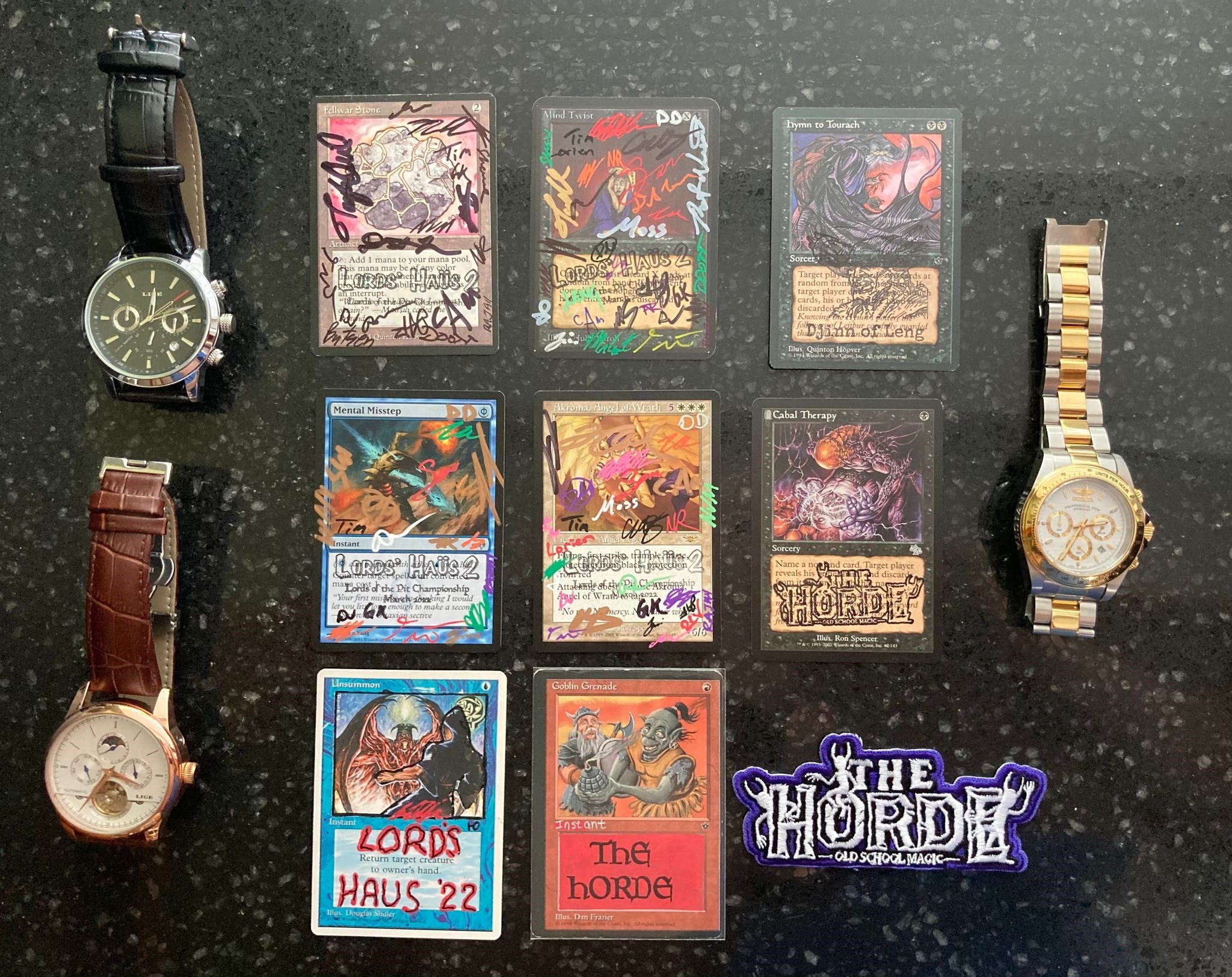 The champ marched off with his second Golden Lord. His P1P1 from the prize pool was a fitting meme end, with a repeat of the previous Haus’ power drill selection. My Top 8 finish garnered an early pick. I perused the table and noticed a nondescript leather pouch and a couple boxes. Turns out, it was Dom’s contribution and he announced they were watches and cards. Snap select. Dom is a watch connoisseur and a man of style. I am a man in need of both a watch and style. More importantly, it was a way for Dom and I to connect over something he is passionate about and now I have a set of siyaq starter watches so my wrists have class on all occasions.