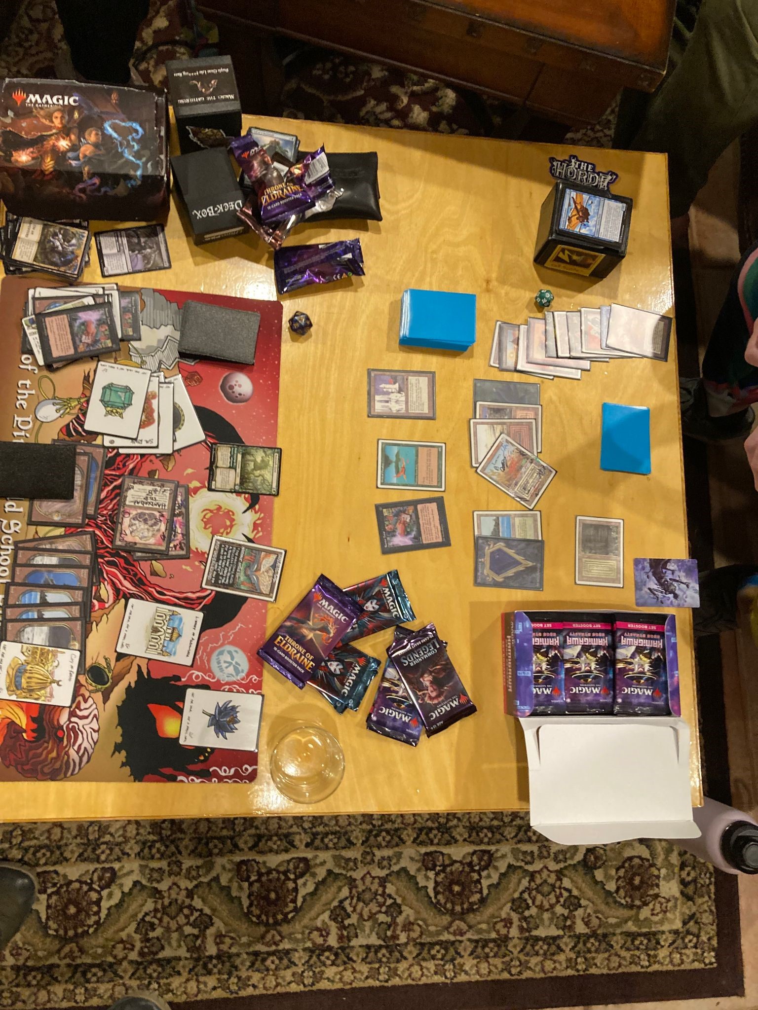 Life has been crazy over the past year with less time for Magic. While I’ve dabbled in MS, I haven’t had the bandwidth to jump all-in and I’m often surprised by the cards and decks in this format. Given that backdrop, and knowing I had a box of Boosters to open, I wanted to play something fast that didn’t care what my opponents did. Trusty old Reanimator it was. Round 1 had a promising start as I blasted Butzen in the face with Akroma. The wheels fell off from there. Shane mulliganed to three and beat me with a siyaq Dreadnought build. Bob combo’d me out with Aluren, also sweet. And Jaco ground me up with some control Oath stew that I didn’t understand. Reanimator remains a fickle mistress that can’t always be trusted. I finished 2-4, but got to see some good friends and crack Boosties between the rounds.