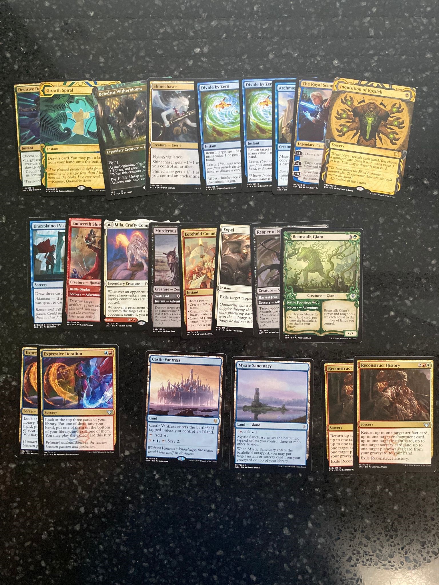 I brought a mixed box of Strixhaven and Thrones of Eldraine as my packs of choice. Strix brings promo cards from Magic’s past and present like Time Warp, Demonic Tutor, and Inquisition. Eldraine brings adventures, built-in two-for-ones, and powerful lands such as Mystic Sanctuary. I matched the packs with a five-color control deck. Counterspells, Control Magic, and Removal. No threats. Boosters can find big fatties when you need them.
