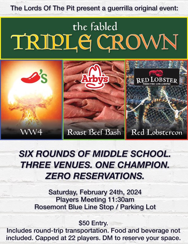 Enter, the fabled Triple Crown. The amalgamation of an ill conceived tournament series concocted by the rancid minds of Moss, Mullen and yours truly. We ideated three separate tournaments based on the run-and-gun casual events from earlier in the club’s history. A return to the Rosemont Chili’s dubbed WW4, the Arby’s Roast Beef Bash, and last but not least, Red Lobstercon. With Lords champing at the bit and friends coming in for Magiccon Chicago, I made the executive decision to merge the three hypothetical events into one foul combo meal.